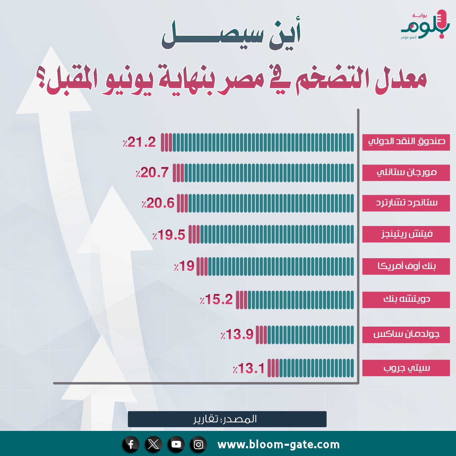 تتوقع المؤسسات المالية أن يتحرك التضخم في مصر في مسار هبوطي واضح في الربع الأول من العام المقبل، مقارنةً بسنة الأساس التي شهدت مستويات تضخمية مرتفعة، على أن يستكمل هذا المسار حتى نهاية العام، وقرر البنك المركزي المصري تمديد الأفق الزمني لمعدلات التضخم المستهدفة، حيث حُددت المعدلات المستهدفة لتكون 7% (± 2 نقطة مئوية) في المتوسط للربع الأخير من 2026، و5% (± 2 نقطة مئوية) في المتوسط للربع الرابع من 2028، ويسلط الإنفوجراف التالي الضوء على تقديرات المؤسسات العالمية للتضخم في 2024 – 2025.