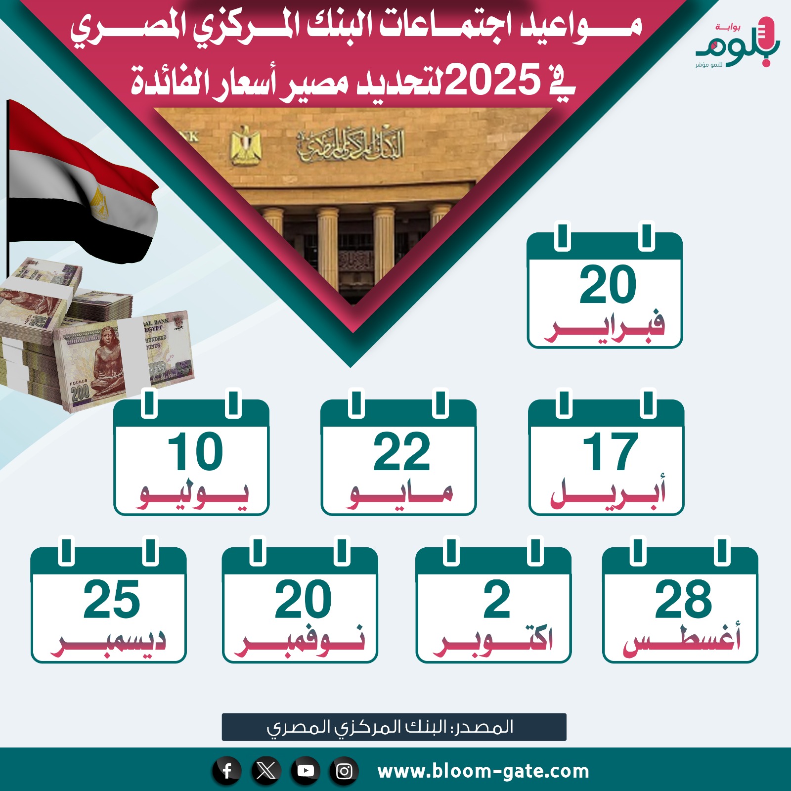 تتجه التوقعات أن يبدأ البنك المركزي المصري نهج سياسة خفض أسعار الفائدة في الربع الأول من العام المقبل، مع انخفاض وتيرة التضخم، وارتفعت أسعار الفائدة في 2024 بواقع 800 نقطة أساس إلى 27.25% و28.25% للإيداع والإقراض لليلة واحدة على الترتيب، ويعقد البنك المركزي المصري 8 اجتماعات لتحديد مصير أسعار الفائدة خلال العام الجديد وهو ما يتناوله الإنفوجراف الآتي.