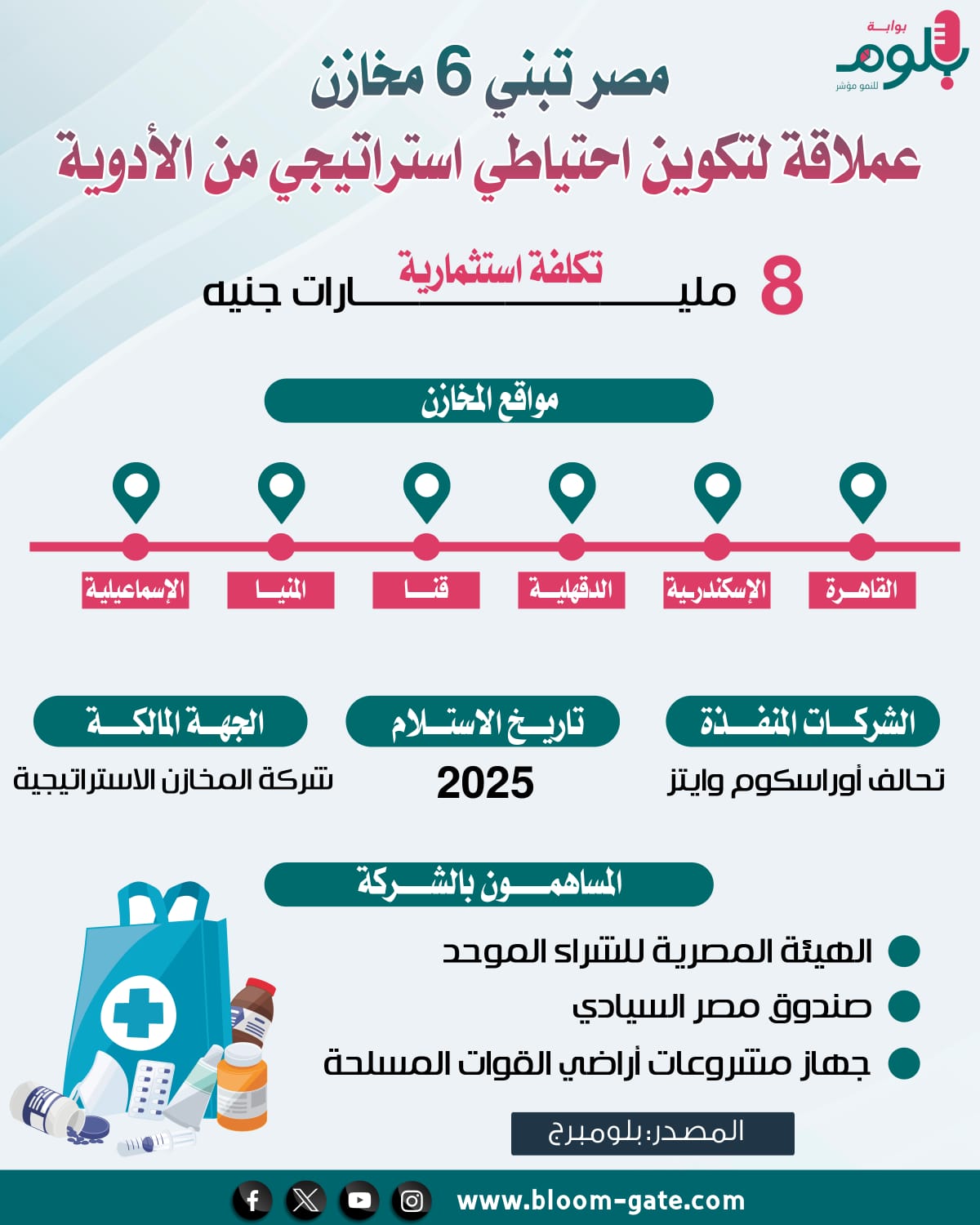 وتعكف الحكومة على تنفيذ المشروع القومي للمستودعات الخاصة بالأدوية، بهدف بناء مخازن استراتيجية تغطي العاصمة والوجهين البحري والتبليغ ومدن القناة، بما يسهم في تكوين احتياطي استراتيجي من الأدوية في مصر والتجهيزات الطبية، يسمح بتغطية احتياجات السوق، وتقليل قرص نقص الأدوية بالسوق، ونستعرض في الإنفوجراف الآتي التوزيع الجغرافي لهذه المخازن والاستثمارات المخصصة لها.