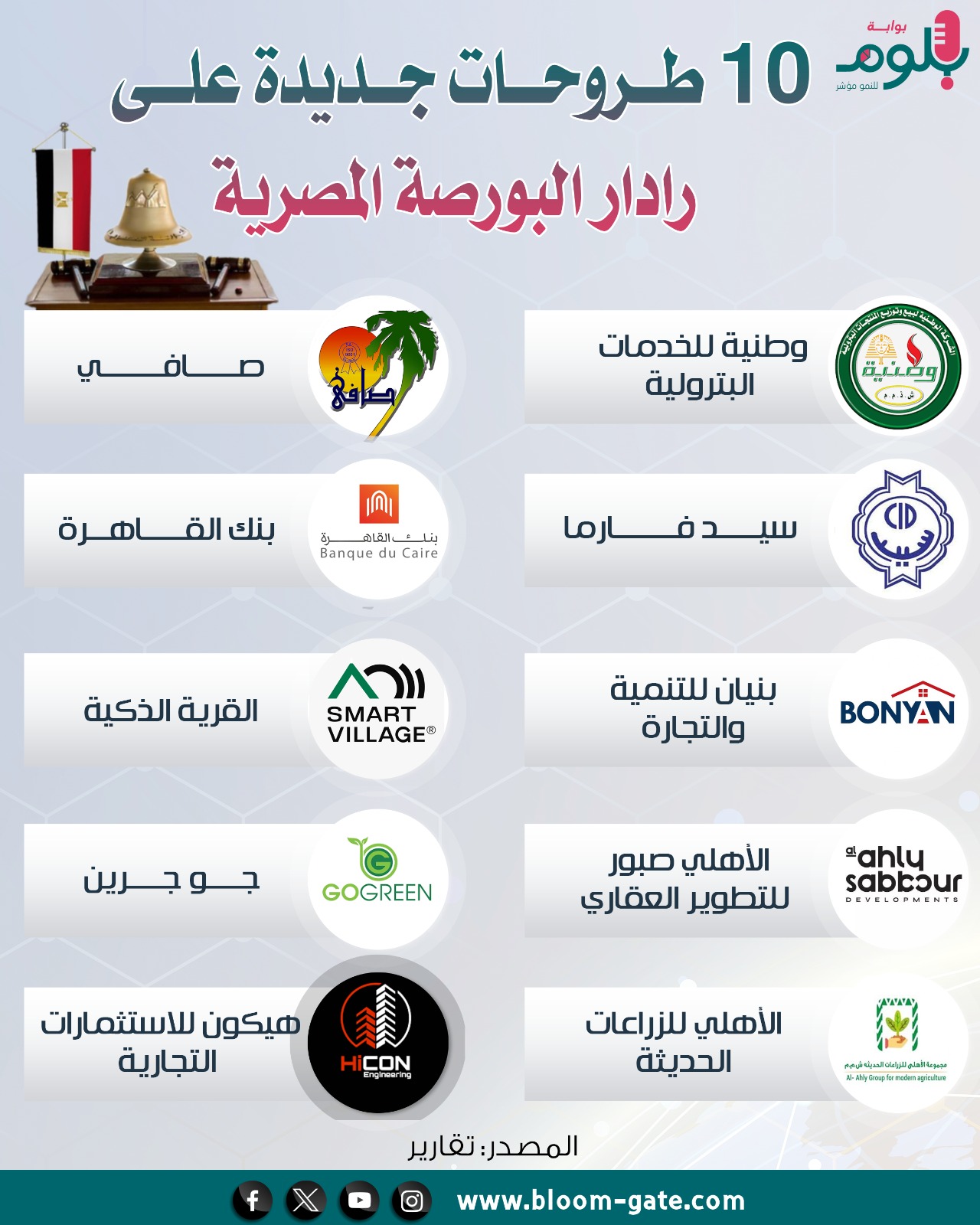 من جانب آخر، تستعد البورصة المصرية لاستقبال طروحات شركات جديدة في قطاعات متعددة تشمل التطوير العقاري والبنوك والإنتاج الزراعي والمياه والبترول، وذلك بعد إتمام الحكومة مؤخراً طرح أسهم المصرف المتحد بسوق الأوراق المالية، ما يسهم في تنويع الأسهم المتاحة أمام المستثمرين وجذب سيولة جديدة وزيادة حجم التداولات وتعزيز عمق السوق وحجم التداولات، ويسلط الأنفوجراف التالي الضوء على أبرز الطروحات المرتقبة بالبورصة خلال الفترة المقبلة.