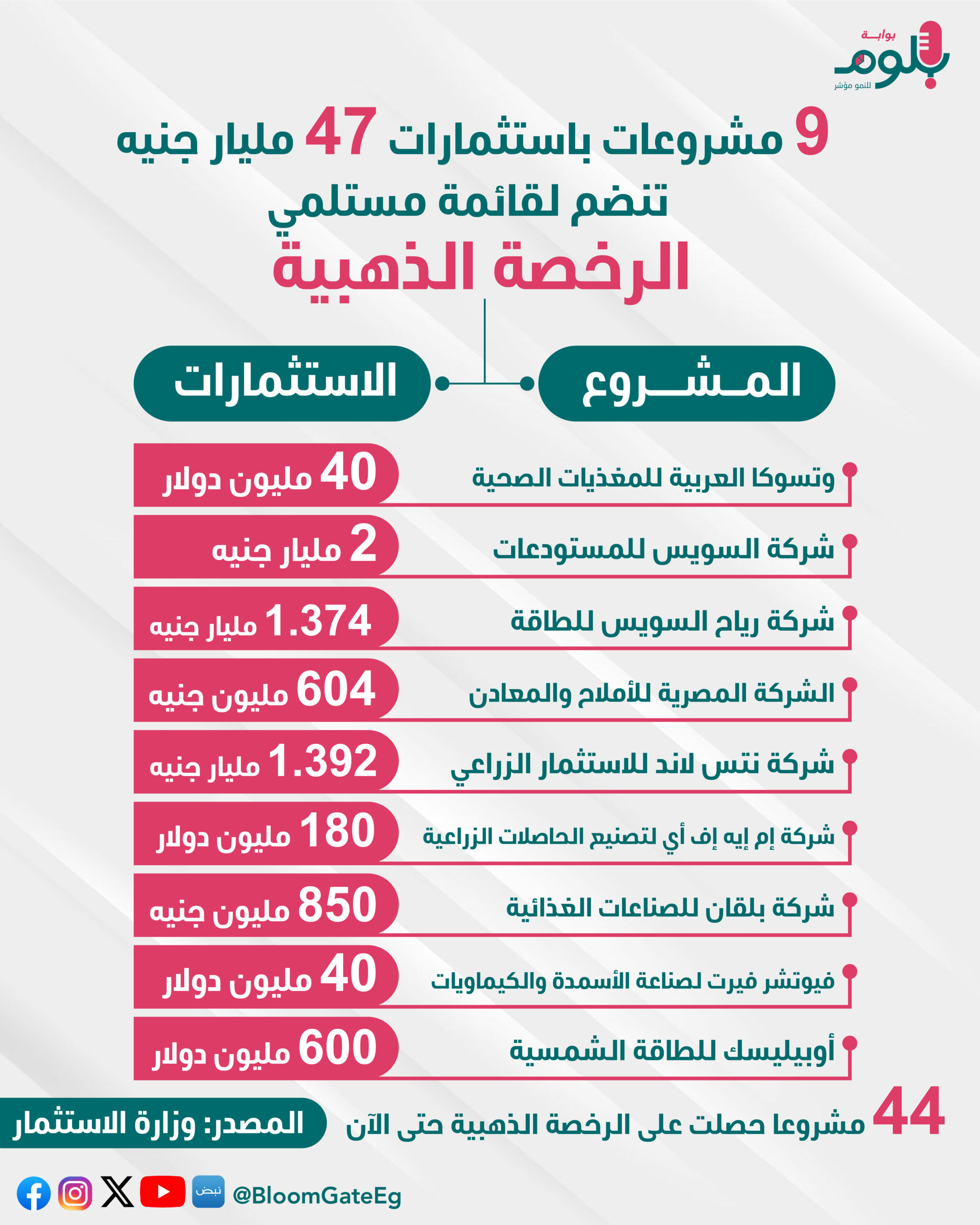 اعتمدت الحكومة منذ عام 2023 على الرخصة الذهبية في تسريع وتيرة تنفيذ المشروعات بعيداً عن الإجراءات البيروقراطية، حيث تعد هذه الرخصة موافقة واحدة على إقامة المشروع وتشغيله وإدارته بما في ذلك تراخيص البنك وتخصيص العقارات، وتحصل عليها الشركات التي تؤسس لإقامة مشروعات استراتيجية أو قمية تسهم في تحقيق التنمية الاقتصادية، وكذلك الشركات التي يتم تأسيسها لإقامة مشروعات المشاركة بين القطاعين الخاص والحكومي في عدة مجالات، ونرصد في الإنفوجراف التالي عدد المشروعات المستفيدة من الرخصة الذهبية حتى الآن وأحدث المشروعات التي حصلت عليها.