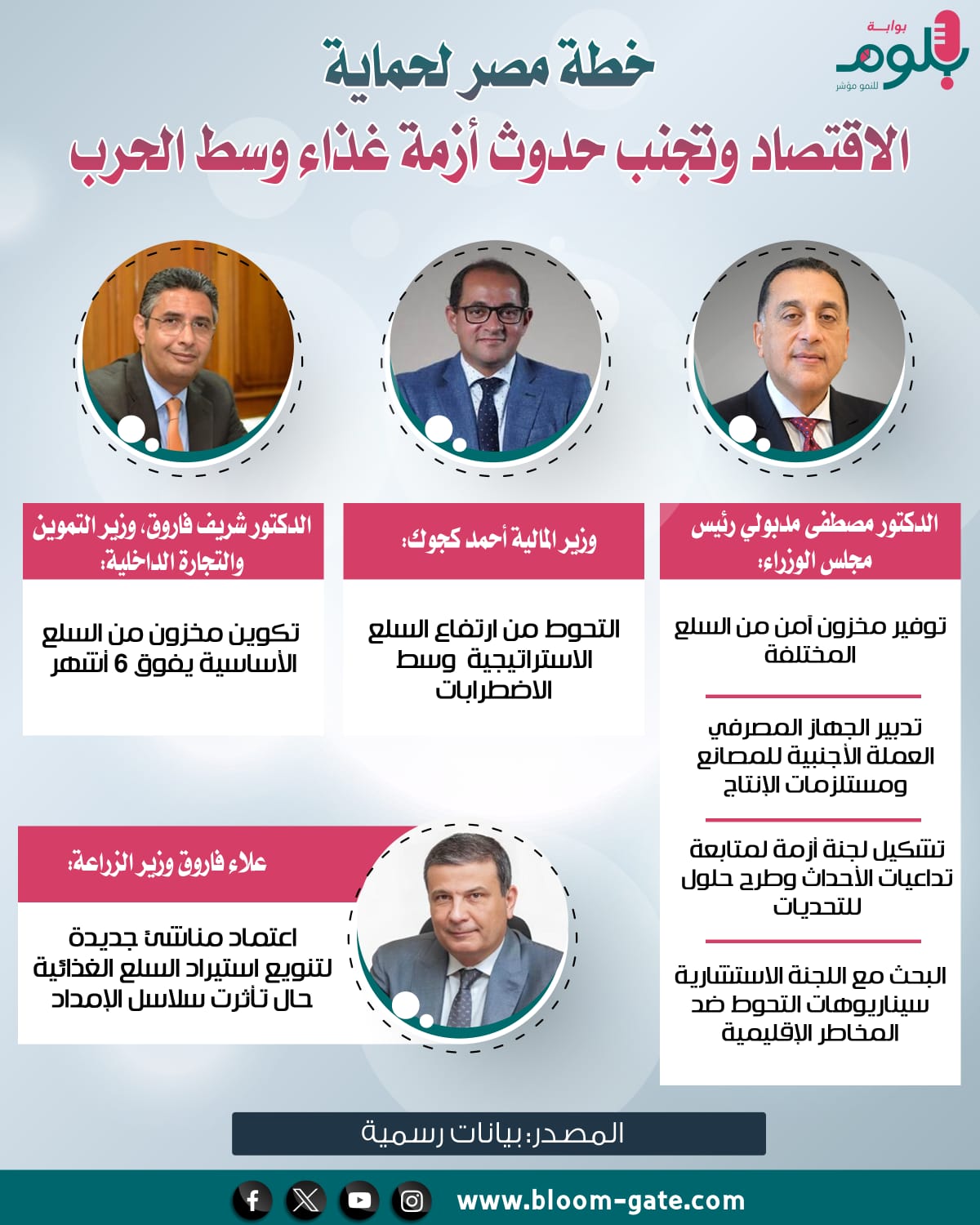 على الجانب الآخر، أبدت الحكومة جاهزيتها لضخ احتياجات السوق المصرية من الأغذية المختلفة خلال فترة الحرب بفضل تكوين مخزون لعدة أشهر من السلع الاستراتيجية وتوفير احتياجات المستوردين من العملة الصعبة، وبحث السيناريوهات المختلفة المتوقعة للحرب بين إسرائيل وإيران وتأثيراتها على مصر ومنها ملف الأغذية، ويستعرض هذا الإنفوجراف التدابير الحكومية للتعامل مع تداعيات الحرب في هذا الشأن.