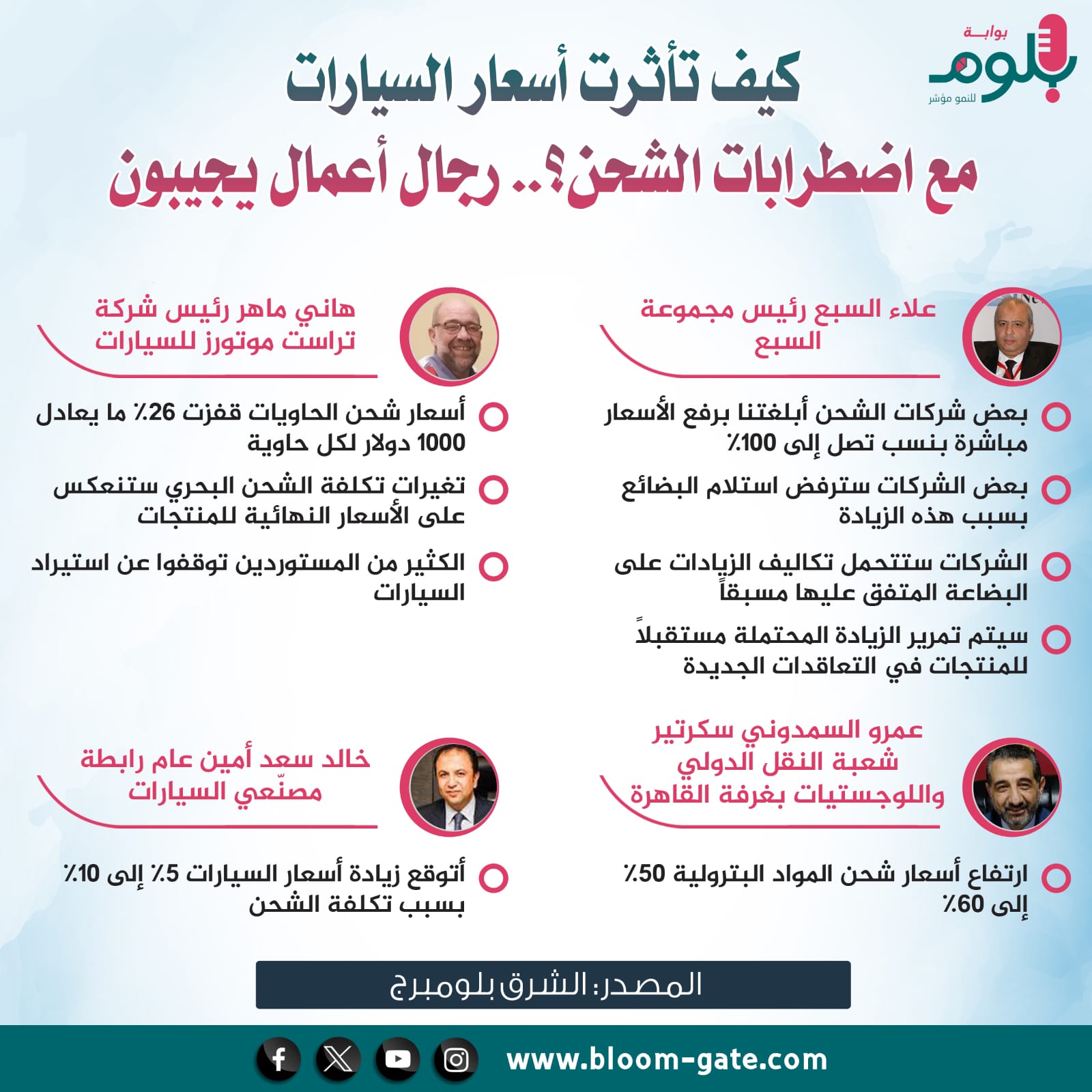 ويقول رجال أعمال ومستوردون إنهم تلقوا إشعارات ومعلومات عن زيادة أسعار شحن البضائع في التعاقدات الراهنة نتيجة اضطرابات المنطقة، مع رهن حركة أسعار الشحن البحري بتطورات الأحداث إقليمياُ الحرب أو استمرارها بشكل عام، خاصةً في ظل ارتفاع أسعار التأمين على البضائع والسفن، وفي ضوء ذلك يرصد هذا الإنفوجراف رؤية القطاع الخاص لتأثير زيادة تكلفة الشحن على أسعار السلع بأكثر من قطاع، وفي مقدمتها قطاع السيارات.