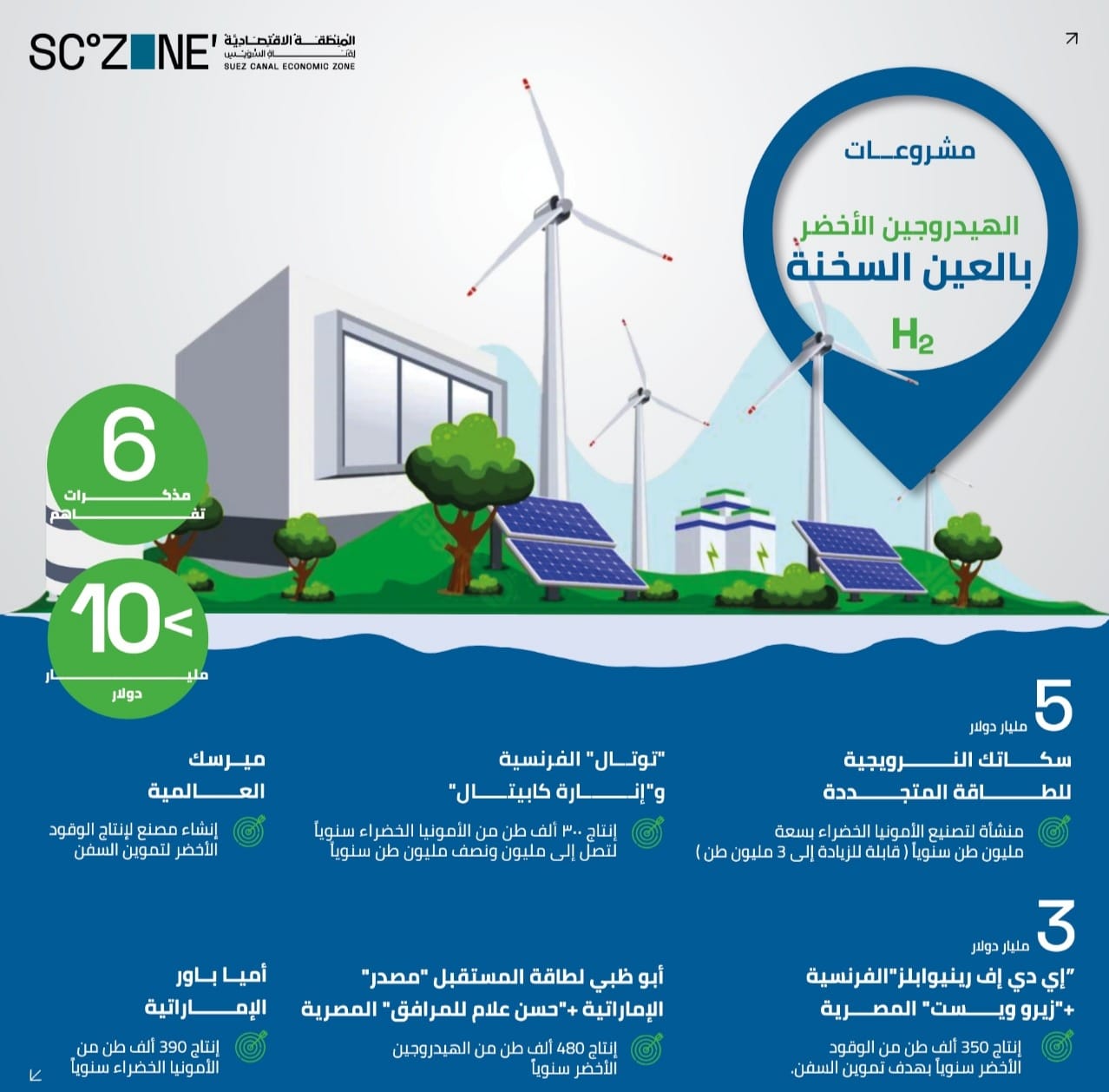 أعلنت المنطقة الاقتصادية لقناة السويس في بيان صادر لها، أن الهيئة قامت بتوقيع ٦ مذكرات تفاهم لمشروعات الهيدروجين الأخضر والأمونيا الخضراء مع كبرى الشركات والتحالفات العالمية، لإقامة منشآت ومجمعات صناعية بمنطقة السخنة لإنتاج الوقود الأخضر واستخدامه في أغراض تموين السفن أو التصدير للأسواق الخارجية.
