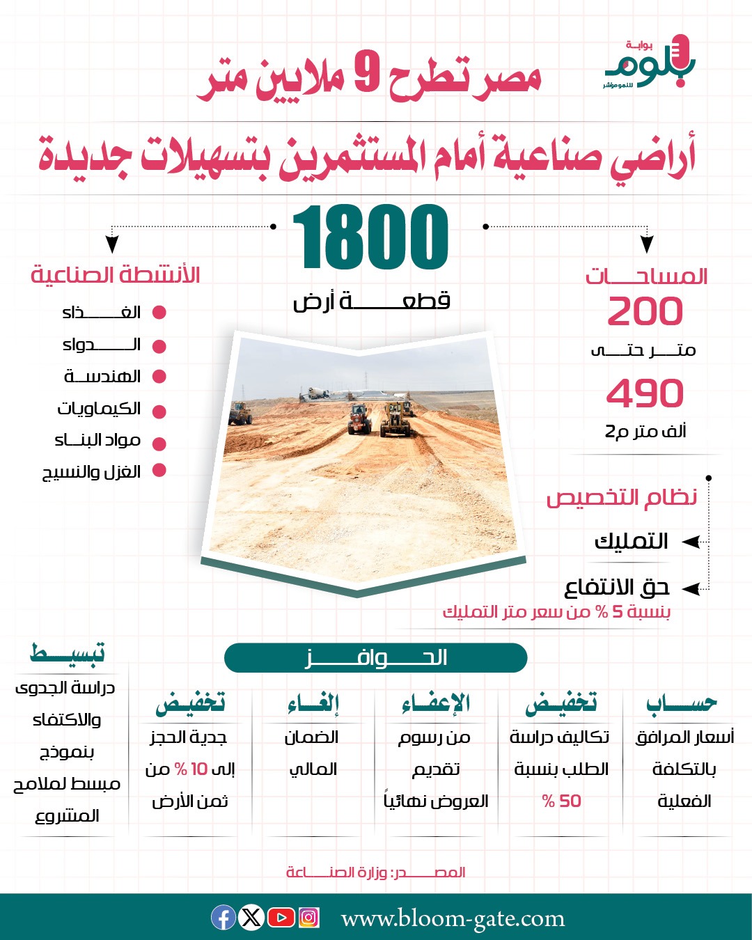 توسعت هيئة التنمية الصناعية في طروحات الأراضي حتى فتحت حتى منتصف يونيو الماضي باب التقدم والحجز إلكترونيًا عبر منصة مصر الصناعية الرقمية لعدد 1800 قطعة أرض صناعية موزعة على 20 محافظة بإجمالي مساحة تتجاوز 9 ملايين متر مربع أراضي صناعية جديدة مكتملة المرافق، وتعمل الآن الهيئة على دراسة وفرز الطلبات للبت فيها، ونستعرض في هذا الإنفوجراف تفاصيل الأراضي من حيث الأنشطة والمساحات والتسهيلات الممنوحة للمستثمرين.