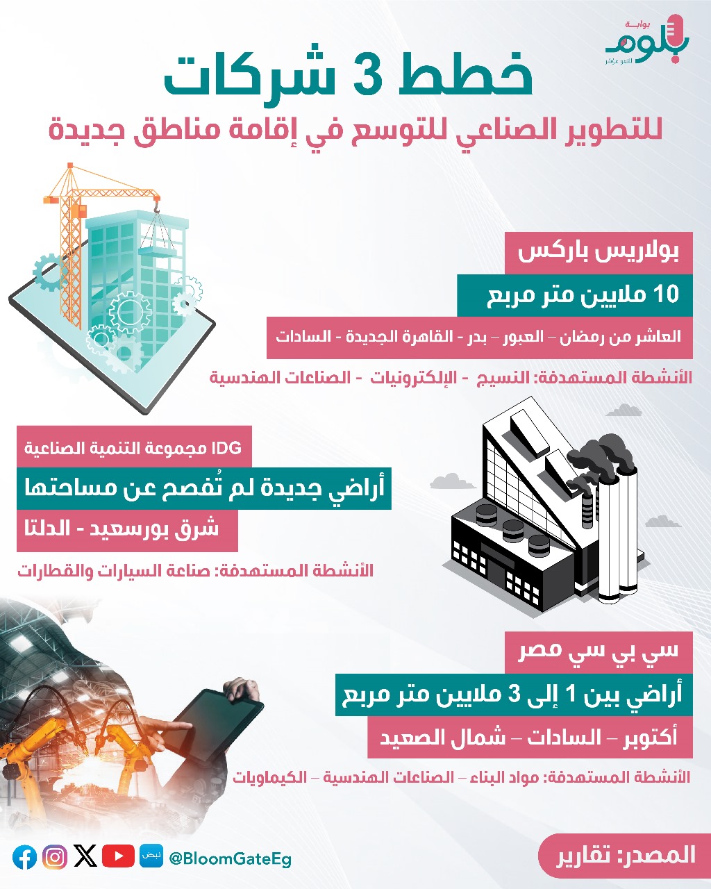وتسعى شركات المطور الصناعي في مصر بصورة مستمرة للحصول على أراضي جديدة، للتوسع في أعمالها بالسوق المصري، وهو ما ظهر في تصريحات مسؤولي الشركات، وفي الطلبات التي يتم تقديمها بصورة مستمرة لجهات الولاية، سواء هيئة المجتمعات العمرانية، أو هيئة التنمية الصناعية، للحصول على أراضي، لتلبية الطلب المتزايد من الشركات الصناعية لإقامة مشروعاتها، وفي الإنفوجراف الآتي سوف نسلط الضوء على خطط شركات، بولاريس باركس، وسي بي سي مصر، ومجموعة التنمية الصناعية IDG للتوسع في الفترة المقبلة.