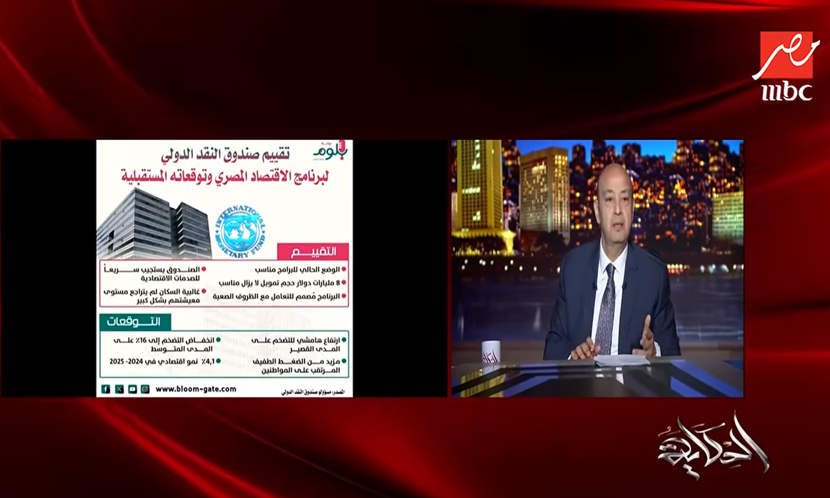 استحوذت مباحثات مصر وصندوق النقد الدولي بشأن برنامج الإصلاح الاقتصادي على حديث الإعلامي عمرو أديب أمس في برنامجه الحكاية، والذي سلط الضوء خلاله على إنفوجراف بوابة «بلوم» الذي نشرته في إصدار صباح أمس من «بلوم جراف»، وذلك مع قرب قدوم بعثة الصندوق لمراجعة برنامج الإصلاح الاقتصادي.