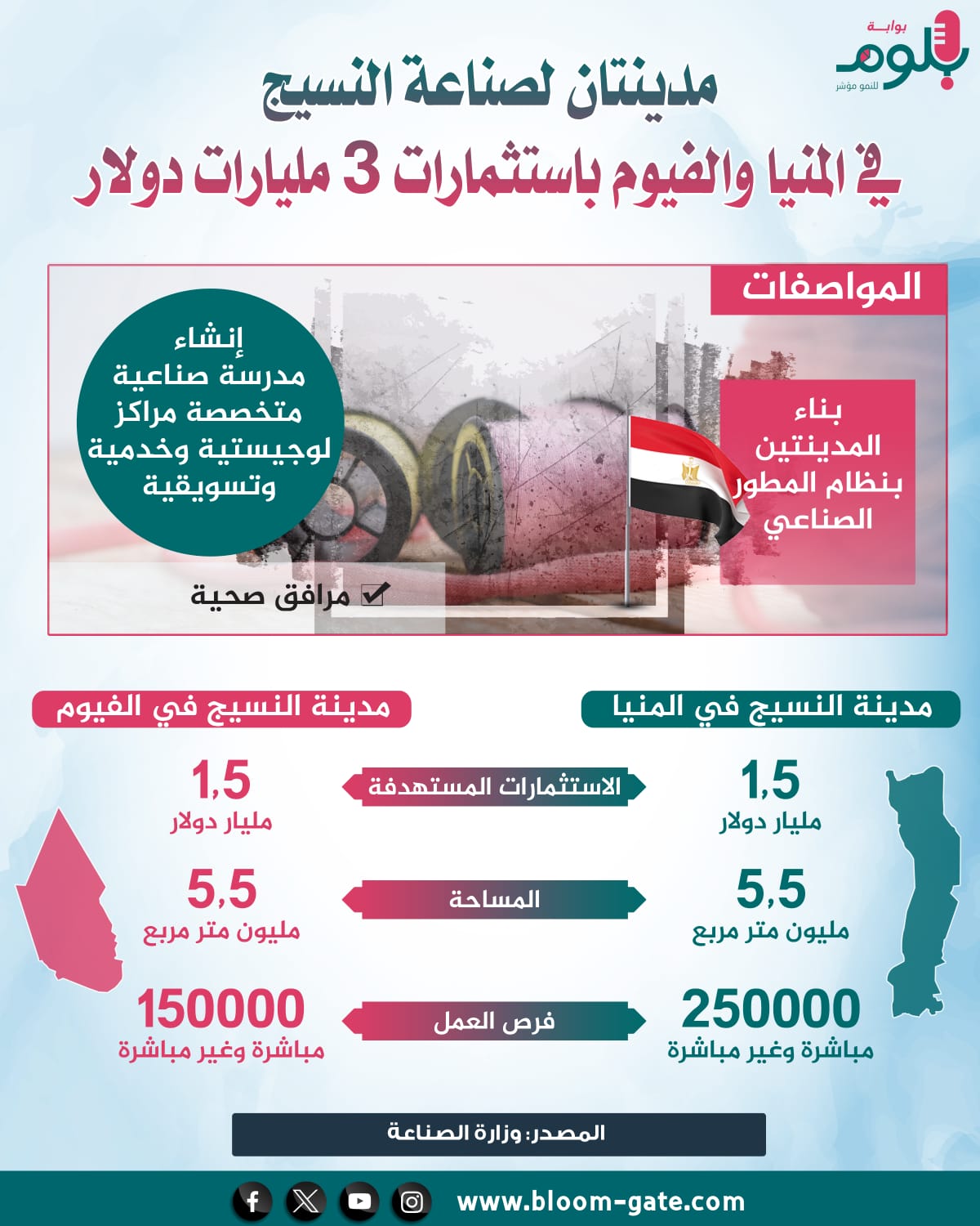 من جانب آخر، أطلقت وزارة الصناعة مدينتين نسيجيتين متكاملتين بمنطقة وادى السريرية بالمنيا والمنطقة الصناعية بشمال الفيوم، على مساحة تصل الى 5.5 مليون م2 لكل منهما، ضمن خطة مضاعفة الصادرات المصرية في هذا القطاع وخاصة الملابس الجاهزة، حيث من المستهدف ان يصل حجم صادراته الى 11.5 مليار دولار خلال 5 سنوات، وللتعرف على تفاصيل المدينتين والاستثمارات المستهدفة يمكن الاطلاع على هذا الإنفوجراف.