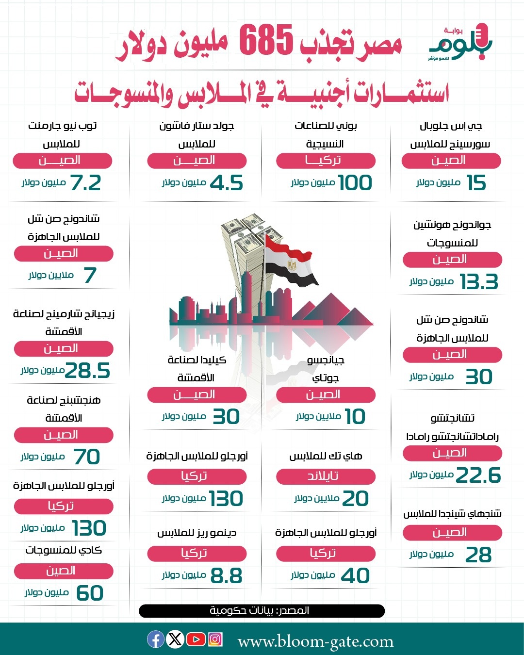 وتمكنت مصر من جذب استثمارات أجنبية مباشرة ببضعة ملايين من الدولارات لبناء العديد من مصانع الملابس الجاهزة والمنسوجات والأقمشة خلال آخر عامين، خاصة بالمنطقة الاقتصادية لقناة السويس، وتحديداً من دول الصين وتركيا وتايلاند، وهي الاستثمارات التي يستعرضها الإنفوجراف الآتي.