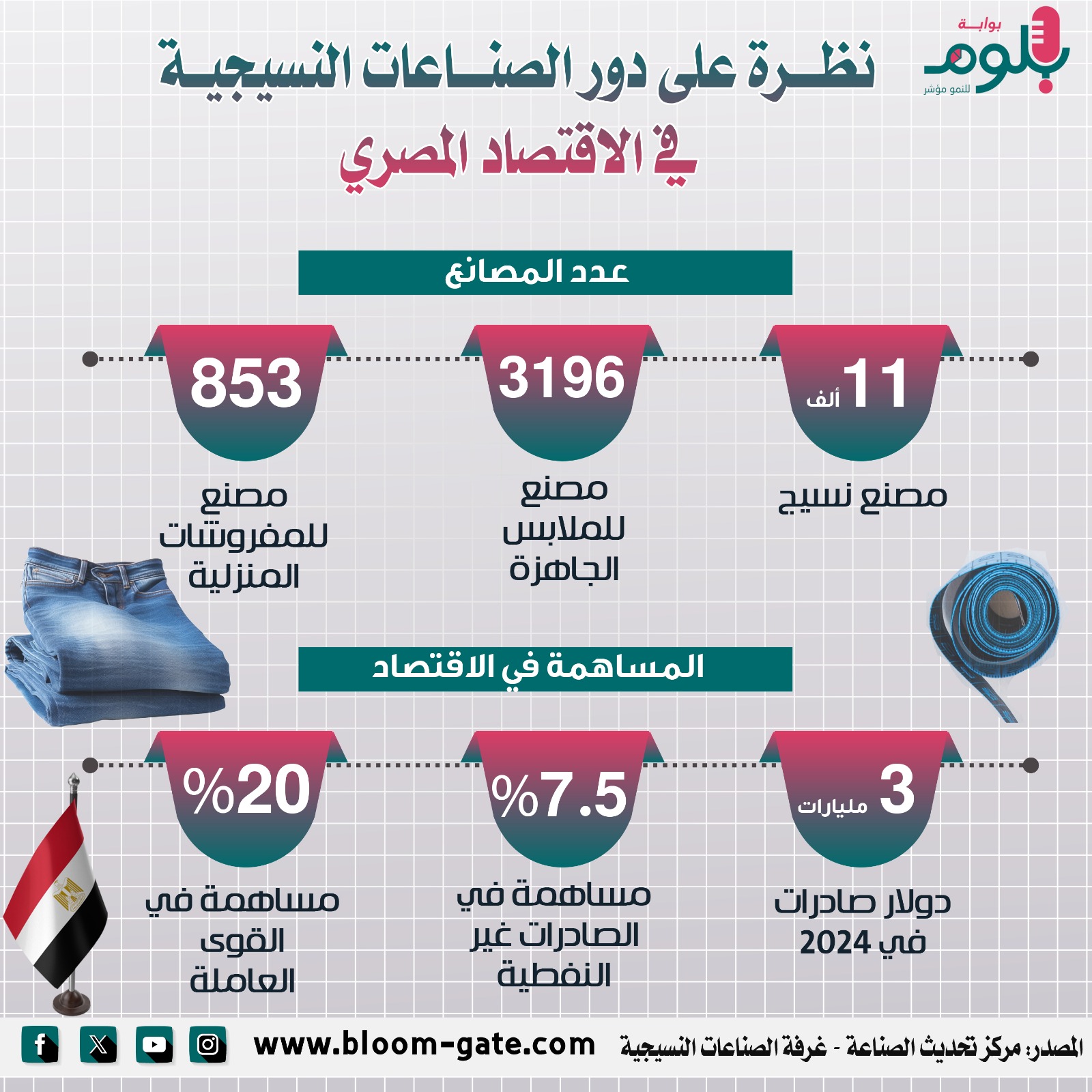 وتعد الصناعات النسيجية أحد الأركان الرئيسية للاقتصاد المصري بفضل قدرتها على توفير عدد كبير من الوظائف لتستحوذ وحدها على خمس قوة العمل بالسوق المحلية، فضلاً عن إسهامها في الصادرات المصرية، وهي الأرقام التي يسلط هذا الإنفوجراف الضوء عليها.