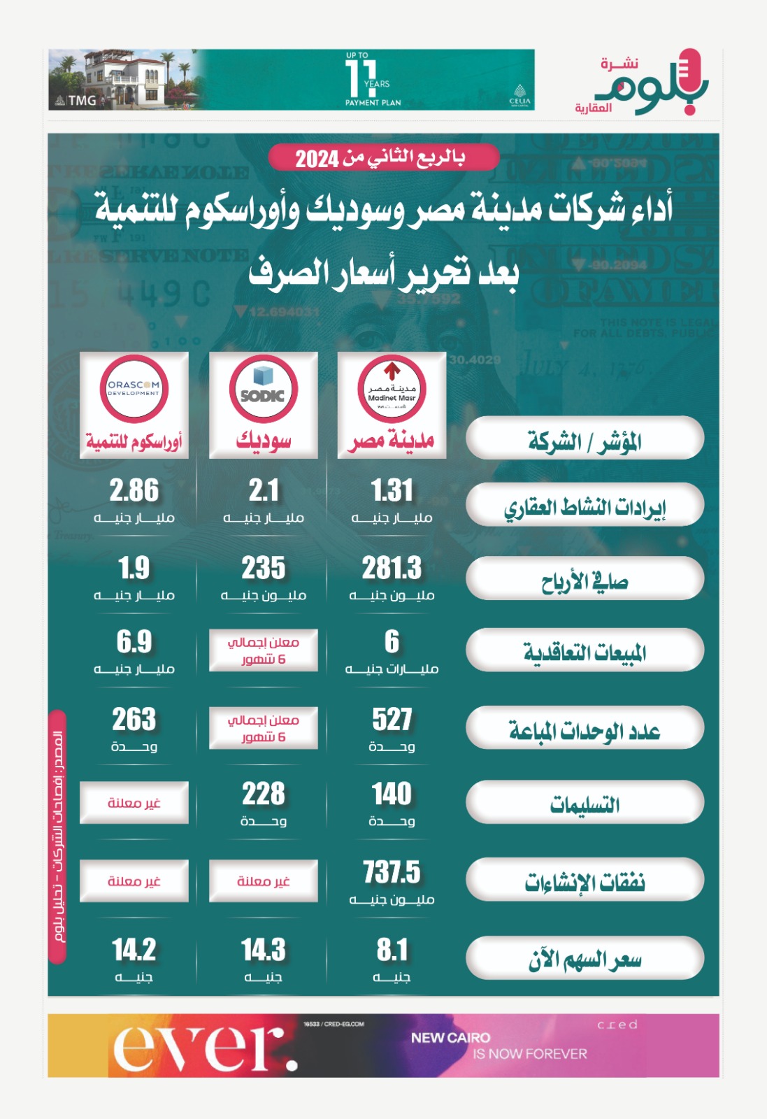 شهد أداء الشركات العقارية تغيرا نسبيا خلال الربع الثاني من العام الجاري، عقب قرارات البنك المركزي المصري بتحرير أسعار الصرف ورفع أسعار الفائدة 6% في مارس الماضي،، وهو ما ظهر بصورة بصورة واضحة في نتائج الأعمال اللي أعلنتها شركات مدينة مصر وسوديك وأوراسكوم، والتي سنسلط الضوء عليها في الإنفوجراف الآتي..