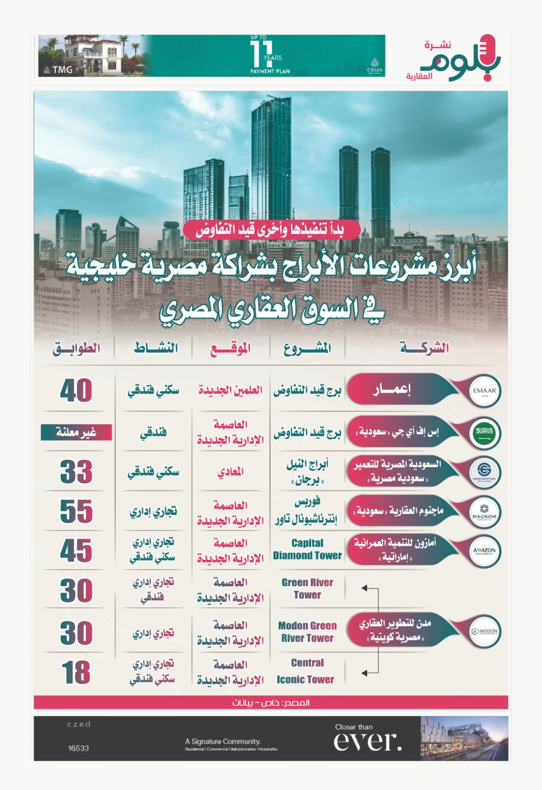 أبرز مشروعات الأبراج بشراكة مصرية خليجية في السوق العقاري المصري.. إنفوجراف