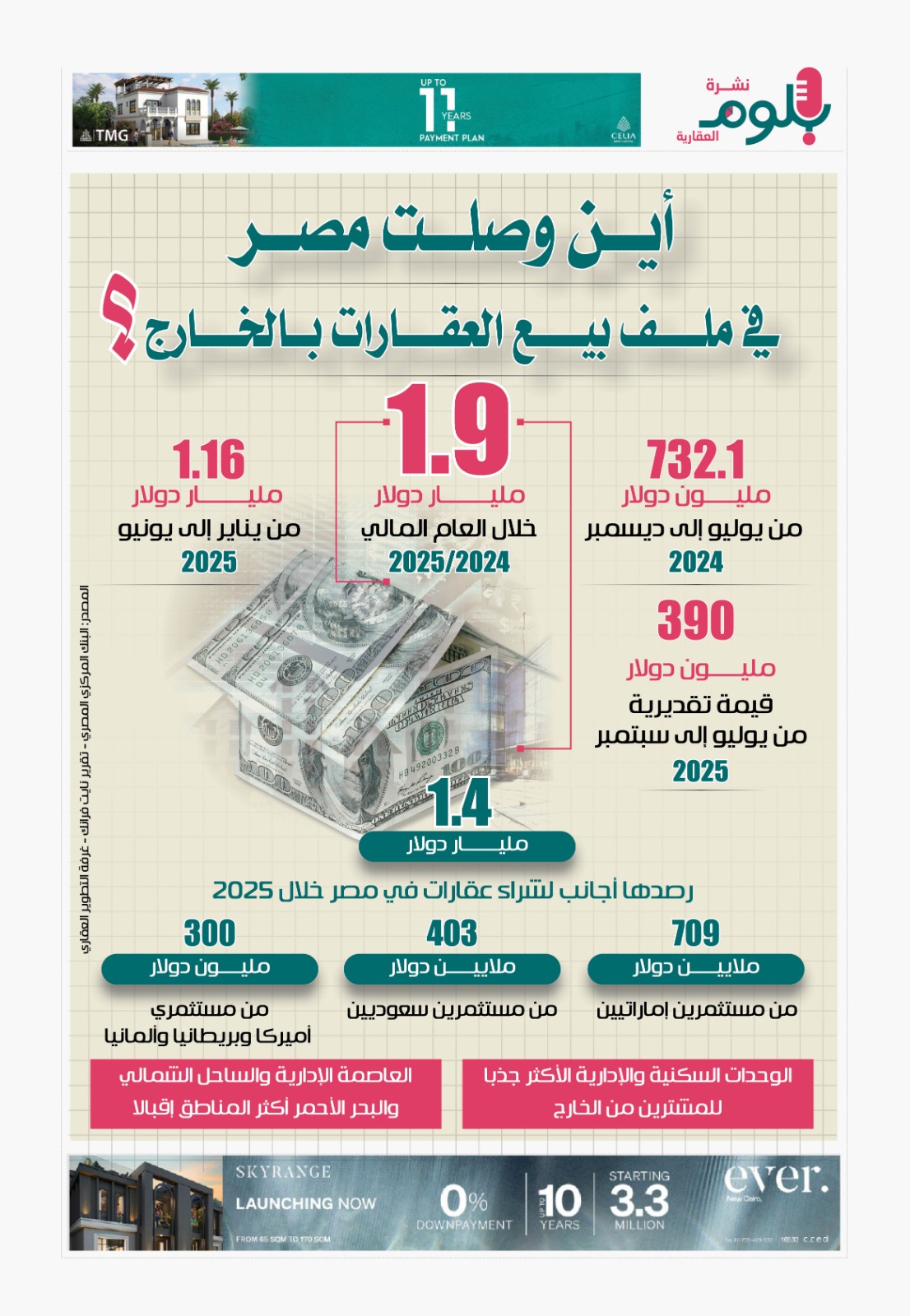 توسعت مصر في بيع العقارات في الخارج، سواء للمصريين المغتربين أو العرب والأجانب، بهدف زيادة الحصيلة الدولارية، والاستفادة من الزخم العمراني، والإقبال المتزايد من مستثمري الخليج على شراء عقارات في مصر خلال الفترة الماضية، وهو ما شجع العديد من الشركات العقارية على تكثيف عمليات التسويق للمشروعات التي تعمل عليها، وجذب عملاء من الخارج، وهو ما ساعدها على تعويض حالة الهدوء التي يواجهها السوق المحلي، وفي الإنفوجراف الآتي سوف نستعرض النتائج التي تحققت في هذا الملف.