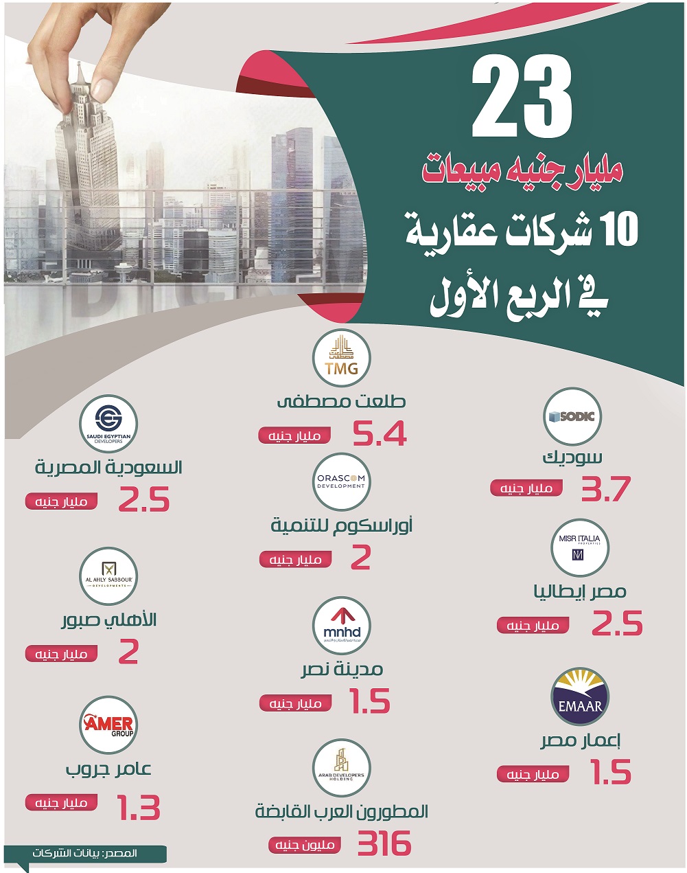 حققت الشركات العقارية مبيعات تعاقدية كبيرة خلال الربع الأول، وهو ما يوضح مدى القوة التي يتمتع بها السوق العقاري في مصر، والطلب المتزايد، على الرغم من التحديات التي يواجهها الاقتصاد المحلي نتيجة الأزمة العالمية، وبلغت قيمة المبيعات الإجمالية التي أعلنت 10 شركات عن تحقيقها نحو 23 مليار جنيه، موزعة على شركات مدرجة في البورصة وأخرى خارجها، وهو ما سنسلط عليه الضوء في الإنفوجراف الآتي..