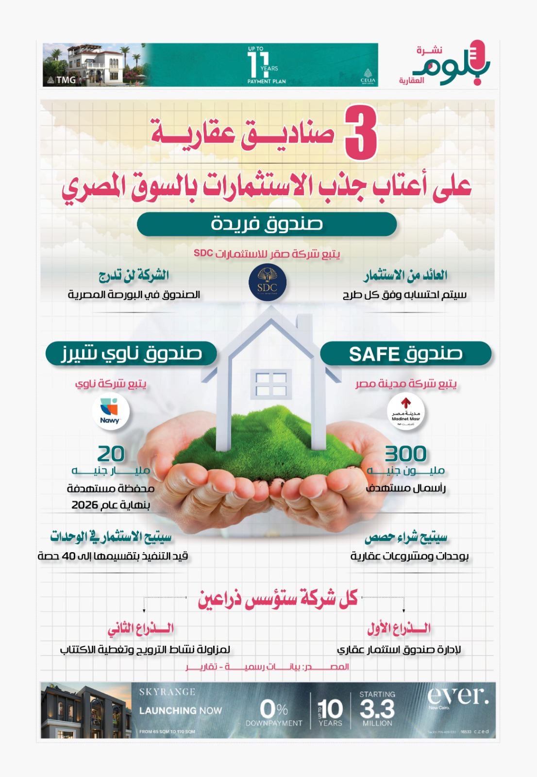 اقتربت 3 صناديق عقارية من بدء الانطلاق رسميا للعمل في السوق المصري خلال الفترة القليلة المقبلة، وهو ما سيكون له دور كبير في توسيع نطاق الاستثمار التشاركي، والعمل تحت مظلة هيئة الرقابة المالية، والتي تتولى حاليا وضع اللمسات الأخيرة على التراخيص الخاصة بالصناديق الثلاثة والتي تتمثل في صندوق SAFE التابع لشركة مدينة مصر، وصندوق ناوي شيرز التابع لشركة ناوي، وصندوق فريدة التابع لشركة SDC، وفي الإنفوجراف الآتي سوف نسلط الضوء على الصناديق الثلاثة وما ستقدمه للسوق العقاري.
