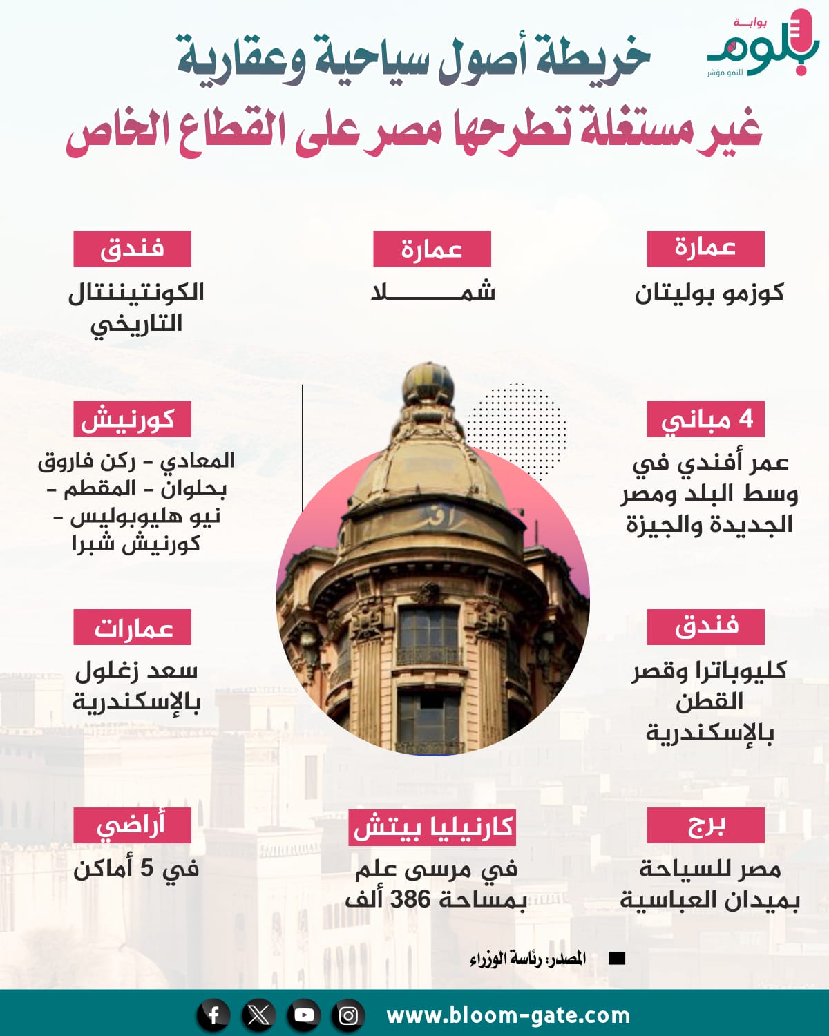 وعقد رئيس الوزراء الدكتور مصطفى مدبولي، اجتماعًا حكوميًا مؤخرًا مع محمد شيمي، وزير قطاع الأعمال العام، وعدد من المسئولين لبحث استغلال بعض الأصول في مجال السياحة والتشييد بالتعاون مع القطاع الخاص، حيث يضم قطاع الأعمال مجموعة من الأصول المتنوعة التي قد تشكل فرصة جذابة للقطاع الخاص، وهي الأصول التي نستعرضها في هذا الإنفوجراف.