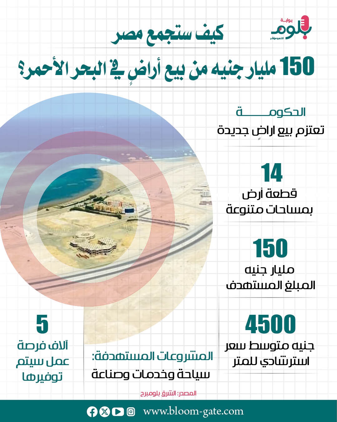 وسنسلط الضوء في الإنفوجراف القادم على أحدث طروحات الأراضي التي تعمل الحكومة على تجهيزها بالبحر الأحمر والمستهدفات المالية منها والأنشطة الاقتصادية المخطط لها.