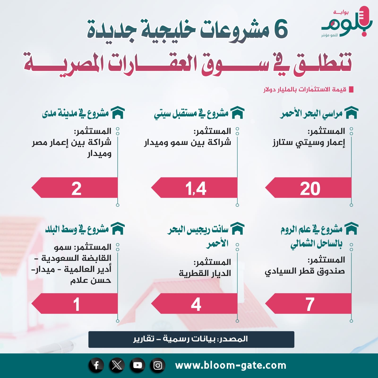 وفي ظل توجه الدولة نحو التوسع في طرح الأراضي، تتدفق مليارات الدولارات من رؤوس الأموال الخليجية إلى مصر خلال الآونة الأخيرة، بهدف تنفيذ مشروعات عقارية عملاقة في أنحاء مختلفة، سواء في الساحل الشمالي بفضل مشروع رأس الحكمة، أو ساحل البحر الأحمر الذي اكتسب زخمًا استثماريًا مؤخرًا، بالإضافة إلى القاهرة التي تظل مركزًا للاستثمارات العقارية، ونتناول في هذا الأنفوجراف أحدث المشروعات العقارية الخليجية المعلنة في مصر.