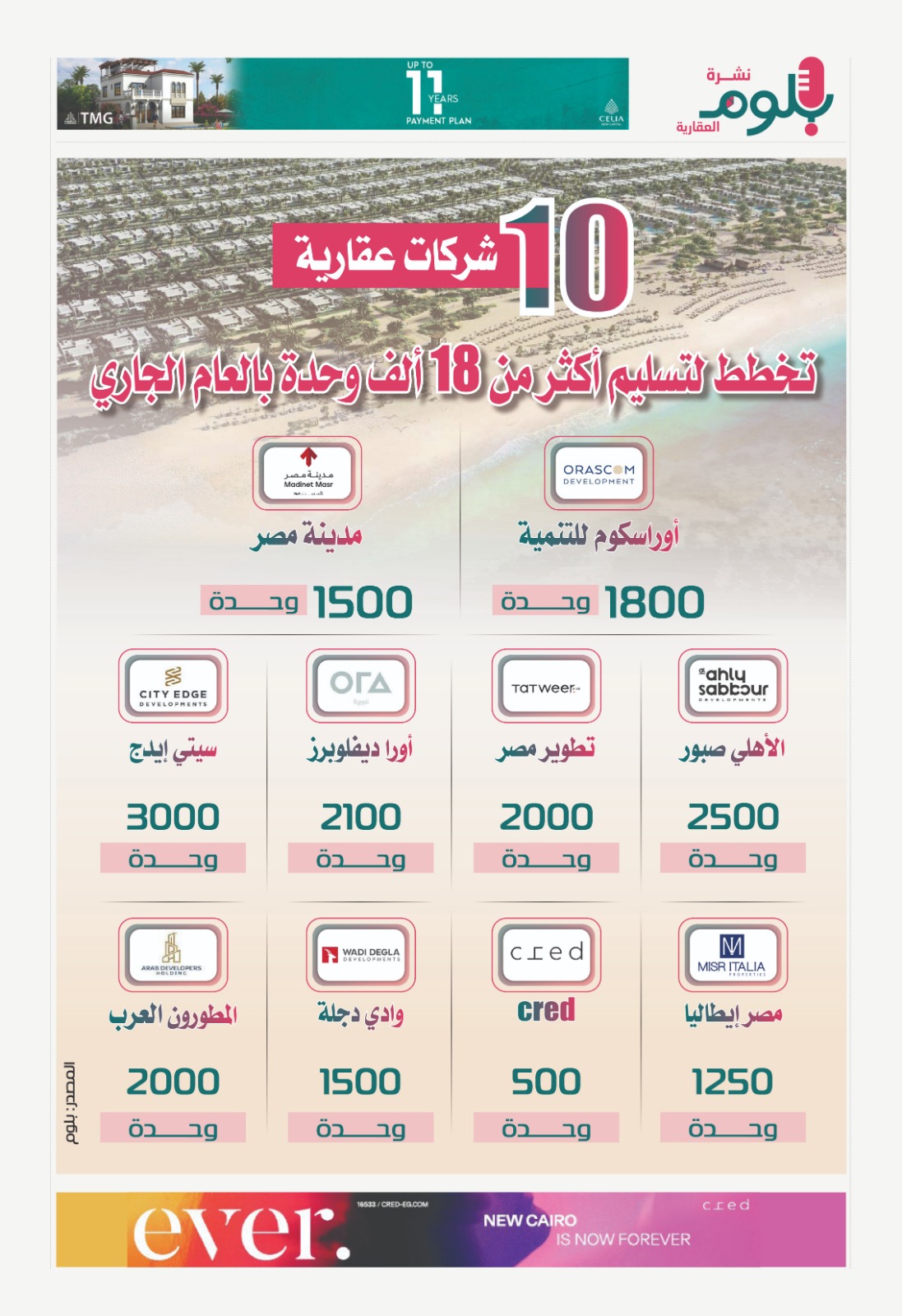 10 شركات عقارية تخطط لتسليم أكثر من 18 ألف وحدة بالعام الجاري.. إنفوجراف