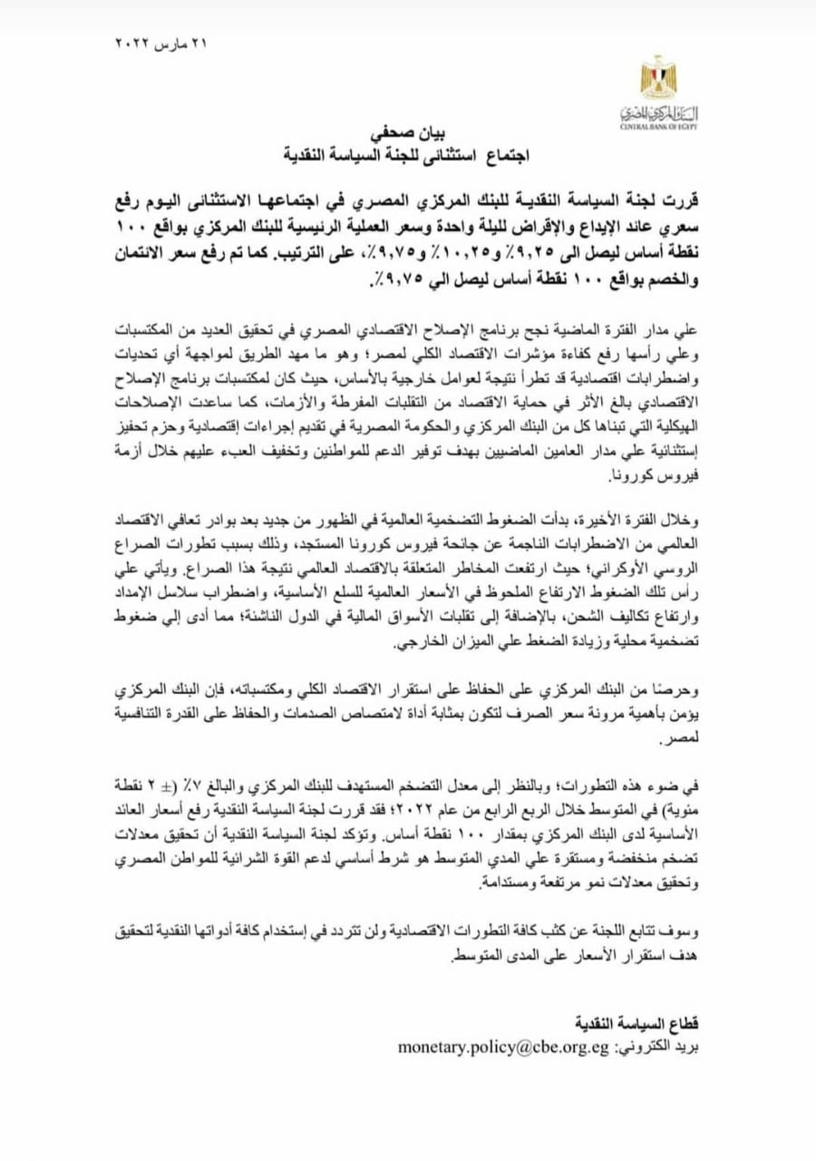 وقال المركزي، إن لجنة السياسة النقدية، قررت في اجتماعها الاستثنائي، رفع سعري عائد الإيداع والإقراض لليلة واحدة وسعر العملية الرئيسية للبنك المركزي 100 نقطة أساس.