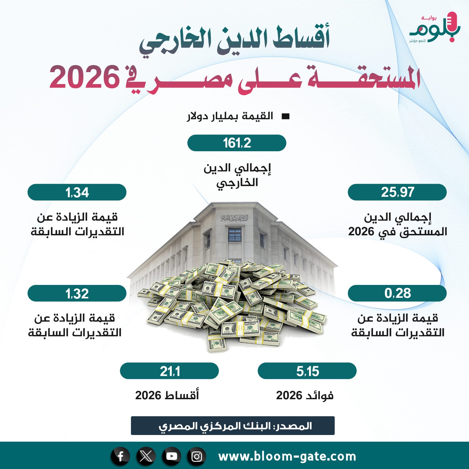 ورفع البنك المركزي مؤخراً أٌقساط الدين المستحقة خارجياً خلال عام 2026 وذلك للمرة الثانية على التوالي بإجمالي قيمة 3.2 مليار دولار، بالتزامن مع زيادة رصيد الاقتراض الخارجي للبلاد، مع التأكيد على التزام مصر بجدول سداد أقساط الدين دون تأخير، ونستعرض في هذا الإنفوجراف حجم أقساط الديون المستحقة والفوائد عليها في 2026.