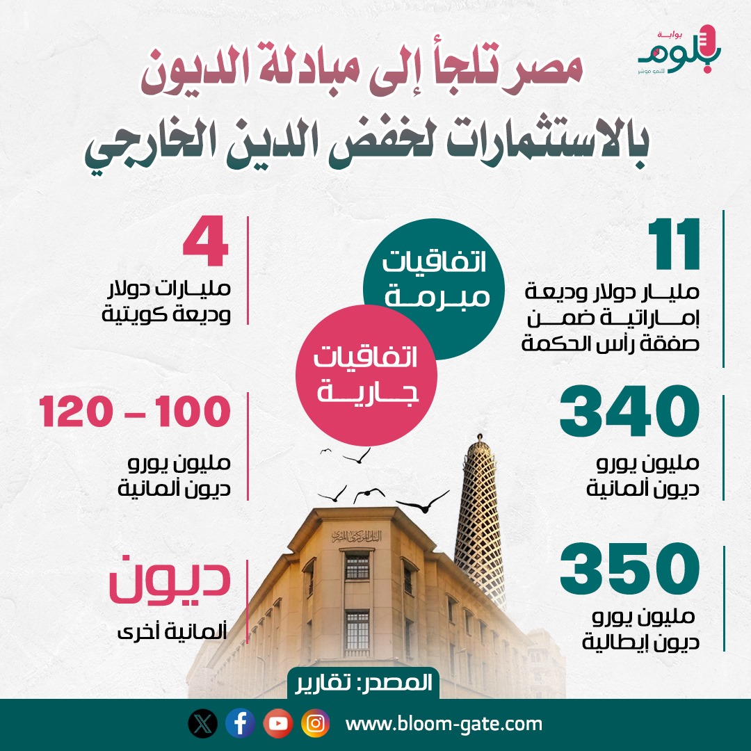 من جانب آخر، تتبنى مصر توجهاً بمبادلة الديون باستثمارات كآلية لتخفيف عبء الدين وتحويلها لاستثمارات أجنبية مباشرة، وكان أبرز هذه الجهود هو الاتفاق مع الإمارات على تنفيذ مشروع رأس الحكمة باستثمارات 35 مليار دولار تتضمن التنازل عن ودائع بقيمة 11 مليار جنيه، وكشفت رانيا المشاط، وزيرة التخطيط والتنمية الاقتصادية والتعاون الدولي أن الحكومة تدرس إبرام المزيد من الصفقات التي تُحوّل فيها ديونها المستحقة لدول أخرى إلى استثمارات في صورة حقوق الملكية بمصر، وهي الجهود التي يسلط هذا الإنفوجراف الضوء عليها مستعرضاً الديون التي تم تحويلها لاستثمارات فعلياً.