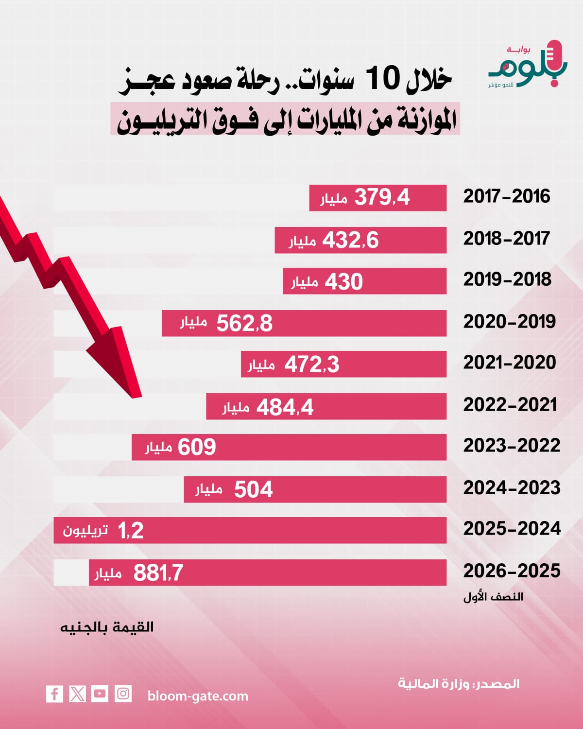 شهد عجز الموازنة في مصر قفزة مهولة خلال السنوات الخمس الأخيرة، حتى تجاوزت قيمة العجز البالغ 516.5 مليار جنيه في النصف الأول فقط من العام المالي الحالي قيمة العجز الذي تكبدته الموازنة في العام المالي 2025/ 2026 بالكامل حيث بلغ 881.7 مليار جنيه، ما يعكس مدى اتساع الفارق بين المصروفات والإيرادات، ونرصد في الإنفوجراف التالي رحلة عجز الموازنة المصرية في السنوات الأخيرة.