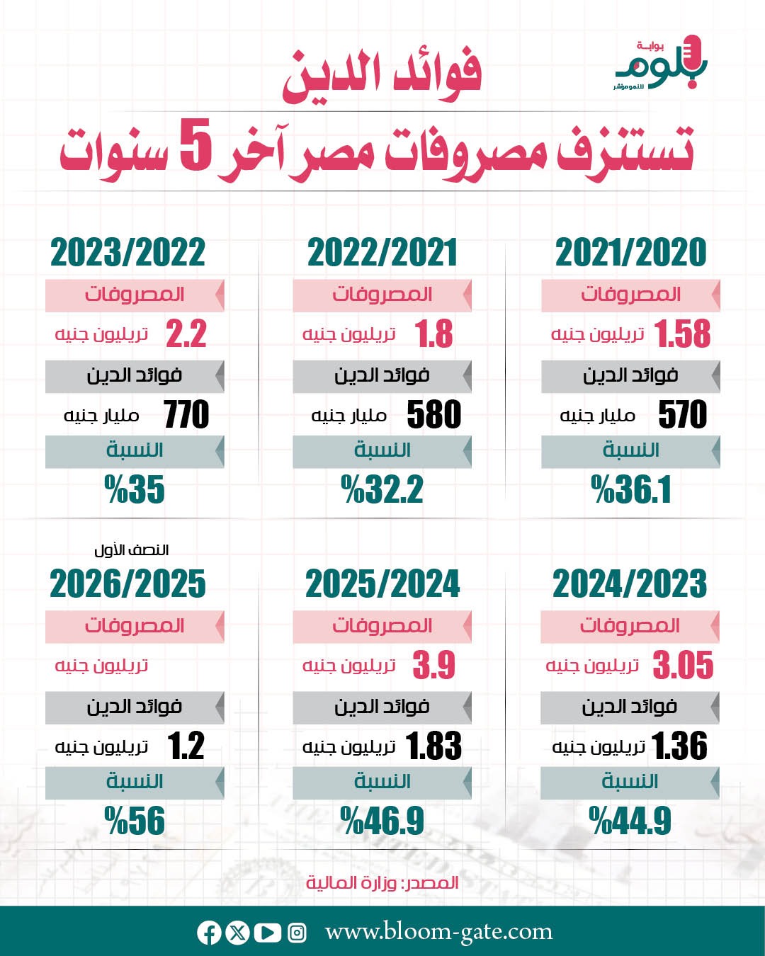 وعند تحليل رحلة مدفوعات خدمة الدين بالموازنات المصرية آخر 5 سنوات، نجد تصاعدًا كبيرًا في نسبتها إلى إجمالي المصروفات، حتى بلغت 56% في النصف الأول من العام المالي 2025-2026، ويتزامن ذلك مع تسارع خدمة الدين خلال السنوات الأخيرة وهي مرشحة للارتفاع خلال السنوات المقبلة، ويرصد هذا الإنفوجراف الارتفاع المتنامي لنصيب خدمة الدين من إجمالي المصروفات خلال 5 سنوات.