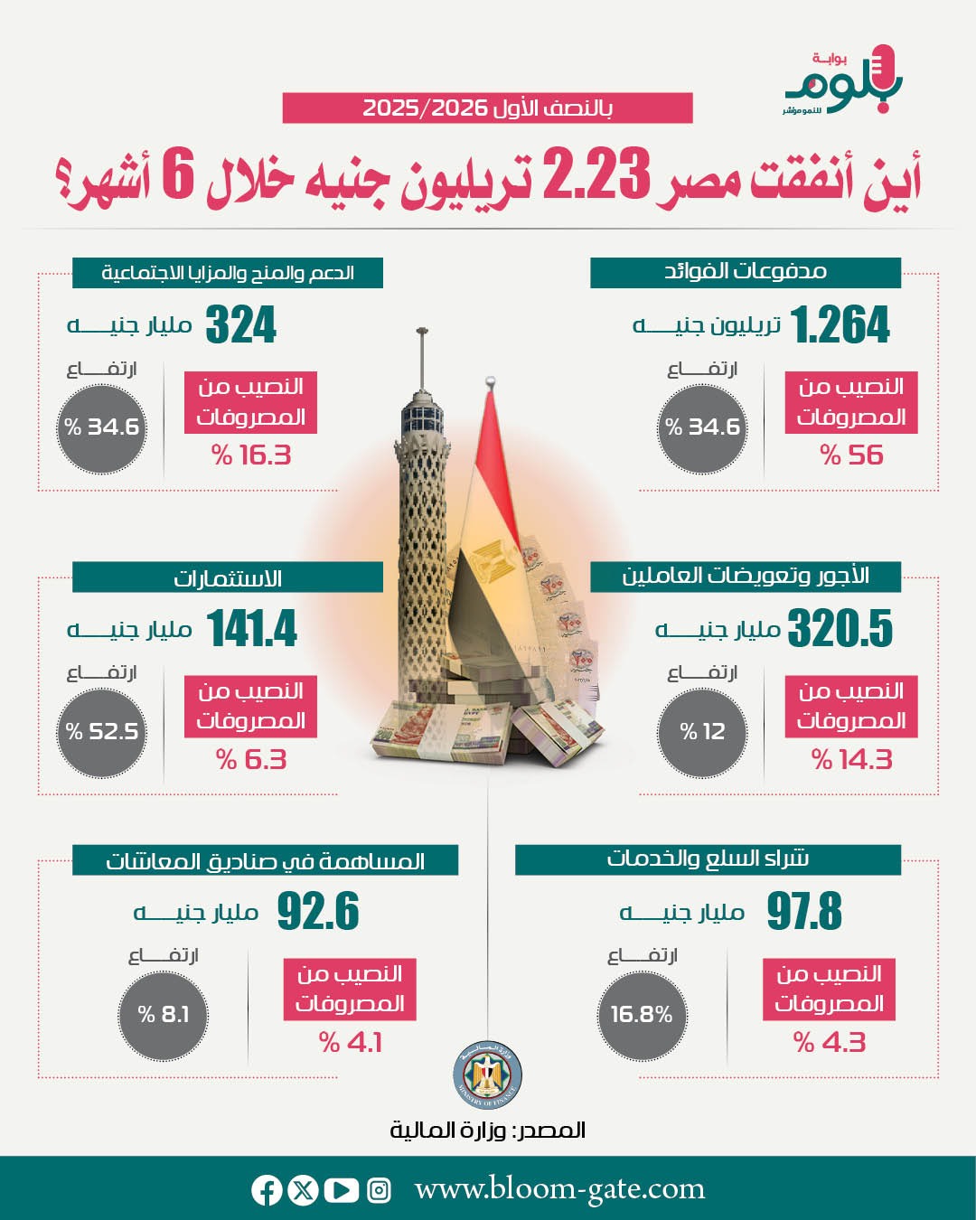 فيما ارتفع إجمالي المصروفات العامة بالموازنة بنحو 474 مليار جنيه وبنسبة 26.9% خلال النصف الأول من العام المالي، فإن هناك 5 بنود رئيسية سيطرت على المصروفات تشمل فوائد الدين والأجور والدعم والاستثمارات وشراء السلع والخدمات، ونرصد في الإنفوجراف الآتي قيمة مصروفات هذه البنود الرئيسية والتغير الذي طرأ عليها.