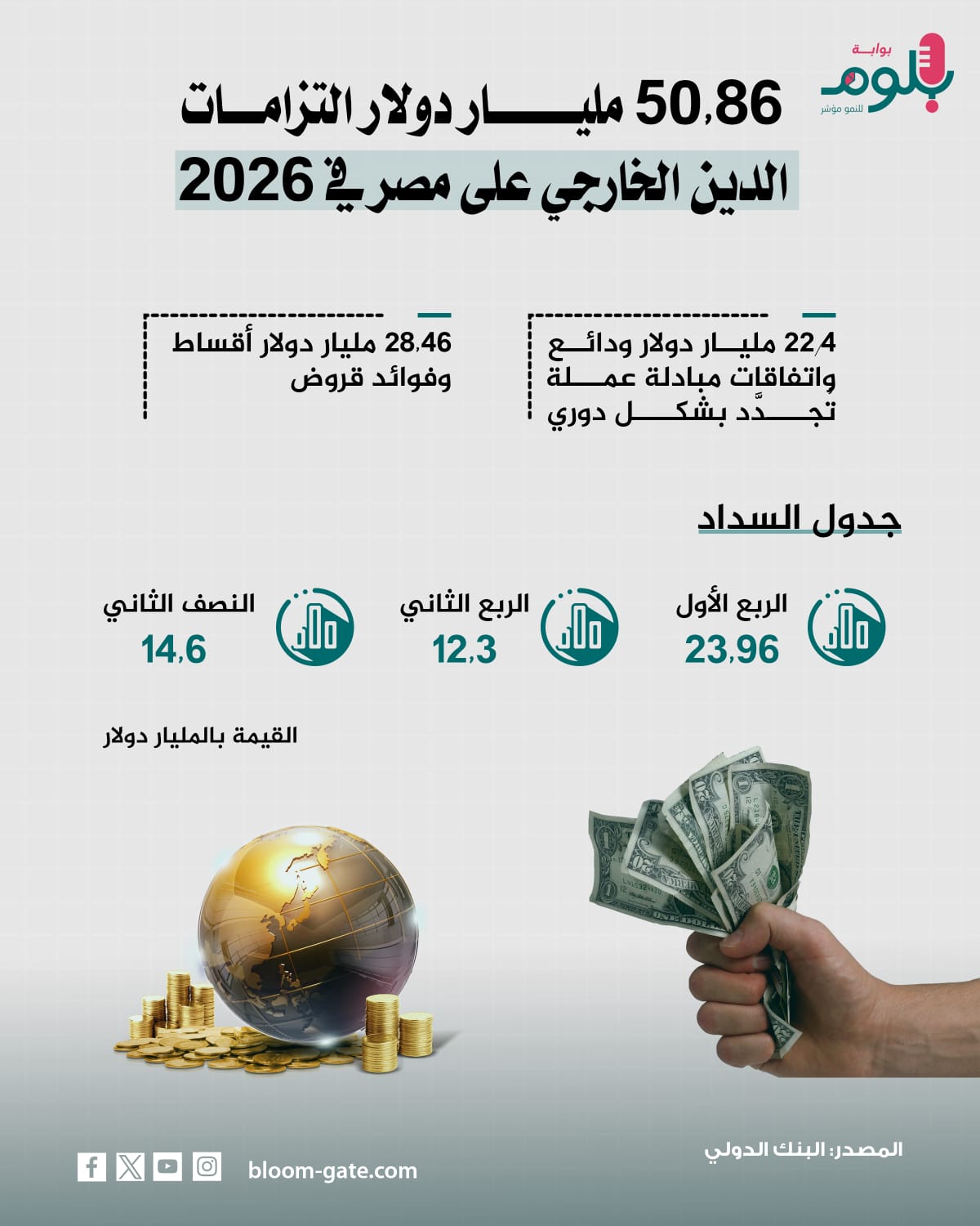 على الرغم من التحسن في موارد البلاد الدولارية ووصول رصيد الاحتياطي لمستوى تاريخي، فإن مصر تواجه تحدي كبيراً يتعلق بالتعامل مع تفاقم الدين، لا سيما الدين الخارجي الذي ارتفع إلى 161.230 مليار دولار بنهاية يونيو 2025، مقابل 156.689 مليار دولار بنهاية مارس 2025، بزيادة قدرها 4.541 مليار دولار، وتشير بيانات البنك الدولي إلى أن خدمة الدين الخارجي تبلغ 50 مليار دولار خلال 2026 من بينها ودائع، وسوف نستعرض في الإنفوجراف الآتي تفاصيل هذه المبالغ المطلوبة العام القادم.