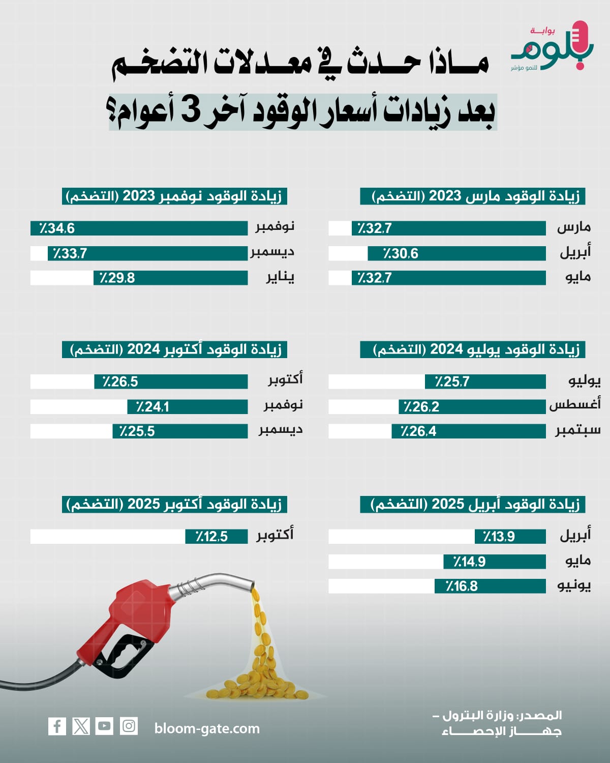 وعلى صعيد التضخم الذي يشكل أهم العوامل المؤثرة في قرار البنك المركزي المصري اليوم الخميس، فإن معدل التضخم السنوي في مدن مصر شهد تسارعاً لأول مرة منذ 4 أشهر خلال أكتوبر إلى 12.5% مقارنة بـ11.7% في سبتمبر، فيما استقر معدل التضخم على أساس شهري عند 1.8%، وجاء ذلك بعد رفع الحكومة أسعار الوقود بنسبة تصل إلى 13% الشهر الماضي، في ثاني زيادة هذا العام، على أن تُثَبّت الأسعار في السوق المحلية لمدة عام على الأقل، ويرصد الإنفوجراف التالي تطور معدل التضخم في مصر خلال آخر 3 سنوات.