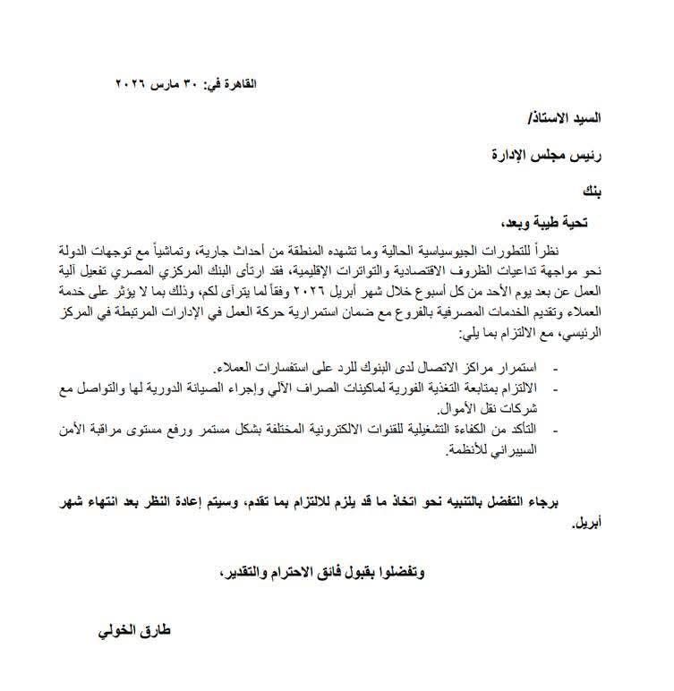 عاجل.. البنك المركزي المصري يوجه البنوك بالعمل عن بعد الأحد أسبوعيًا