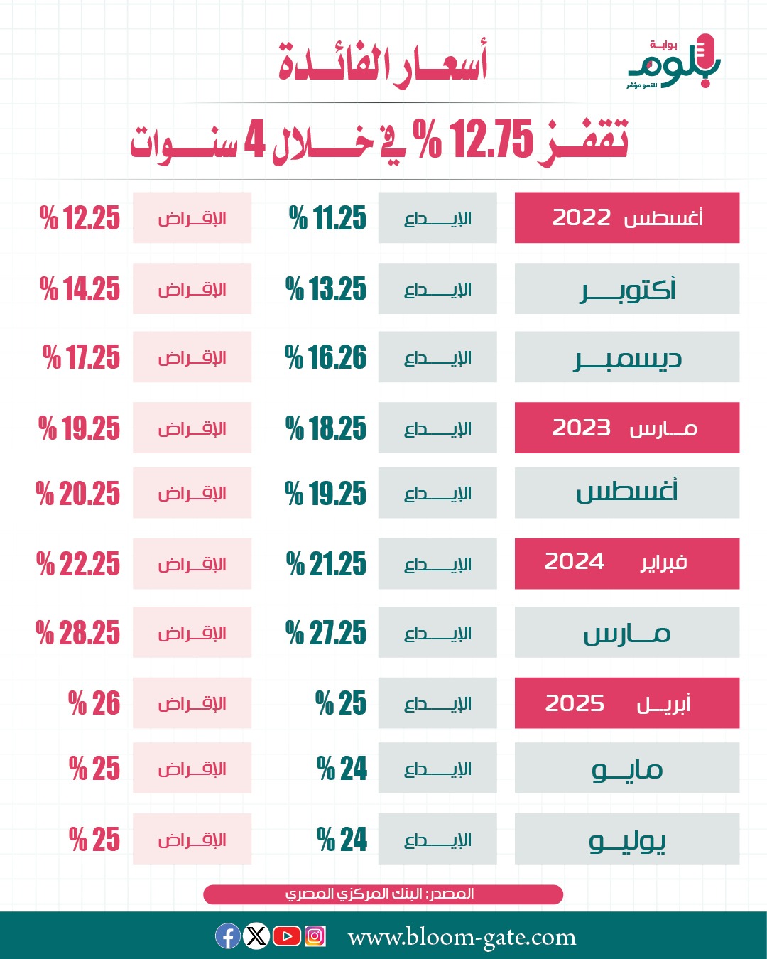 وفي محاولة للسيطرة على التضخم الناجم عن السوق السوداء للعملة الصعبة ثم تعويم سعر الصرف في وقت لاحق ومساعي جذب استثمارات الأجانب لإصدارات الدين الحكومية، اتجهت إدارة البنك المركزي عقب مرور شهرين من ولاية حسن عبدالله الأولى لرفع أسعار الفائدة حتى وصلت إلى اعفى مستوياتها مع قرارات الإصلاح الاقتصادي في مارس 2024 عند 27.25% للإيداع و28.25% للأقراض، وظلت الفائدة عند هذا الحد لمدة 13 شهر حتى بدأ المركزي في خفض متحفظ لأسعار الفائدة، وسط ترقب معدلات التضخم والأحداث الاقتصادية العالمية والاضطرابات الجيوسياسية، ونلقي في هذا الإنفوجراف الضوء على أبرز تحركات أسعار العائد خلال 36 شهراً.
