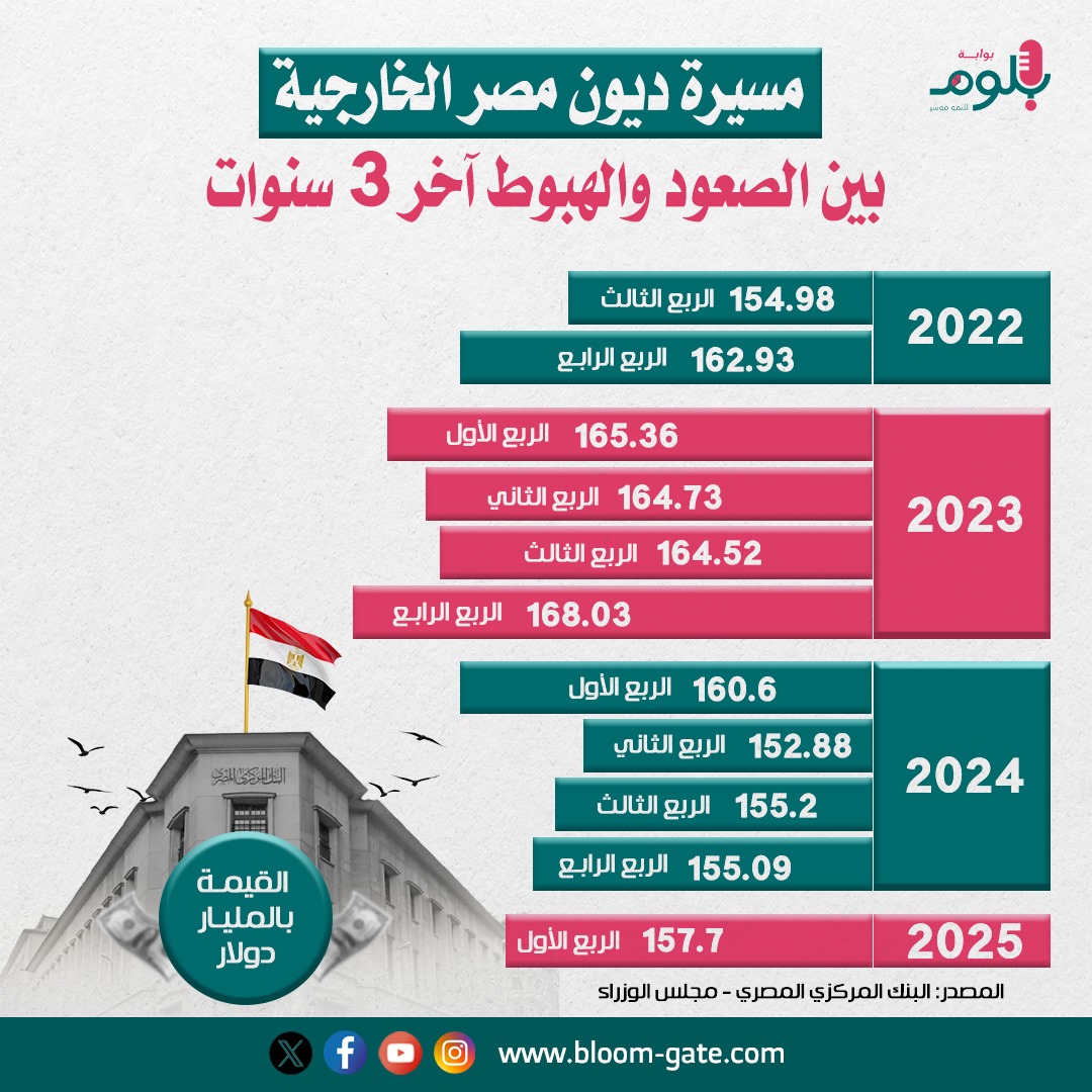 نجح البنك المركزي المصري منذ ولاية حسن عبدالله الأولى حتى الآن في إبطاء معدل نمو الدين الخارجي لمصر، وتمكن من إيقاف تسارع قيمته في عام 2023 حين وصل إلى أعلى مستوى في تاريخه عند 168.03 مليار دولار قبل أن يتراجع إلى 157.7 مليار دولار وفق أحدث البيانات الآن، بفضل صفقة رأس الحكمة التي تتضمنت تحويل ودائع إماراتية بقيمة 11 مليار دولار إلى استثمارات بالمشروع، ونستعرض في هذا الإنفوجراف رحلة الدين الخارجي خلال ولاية محافظ البنك المركزي الحالي.