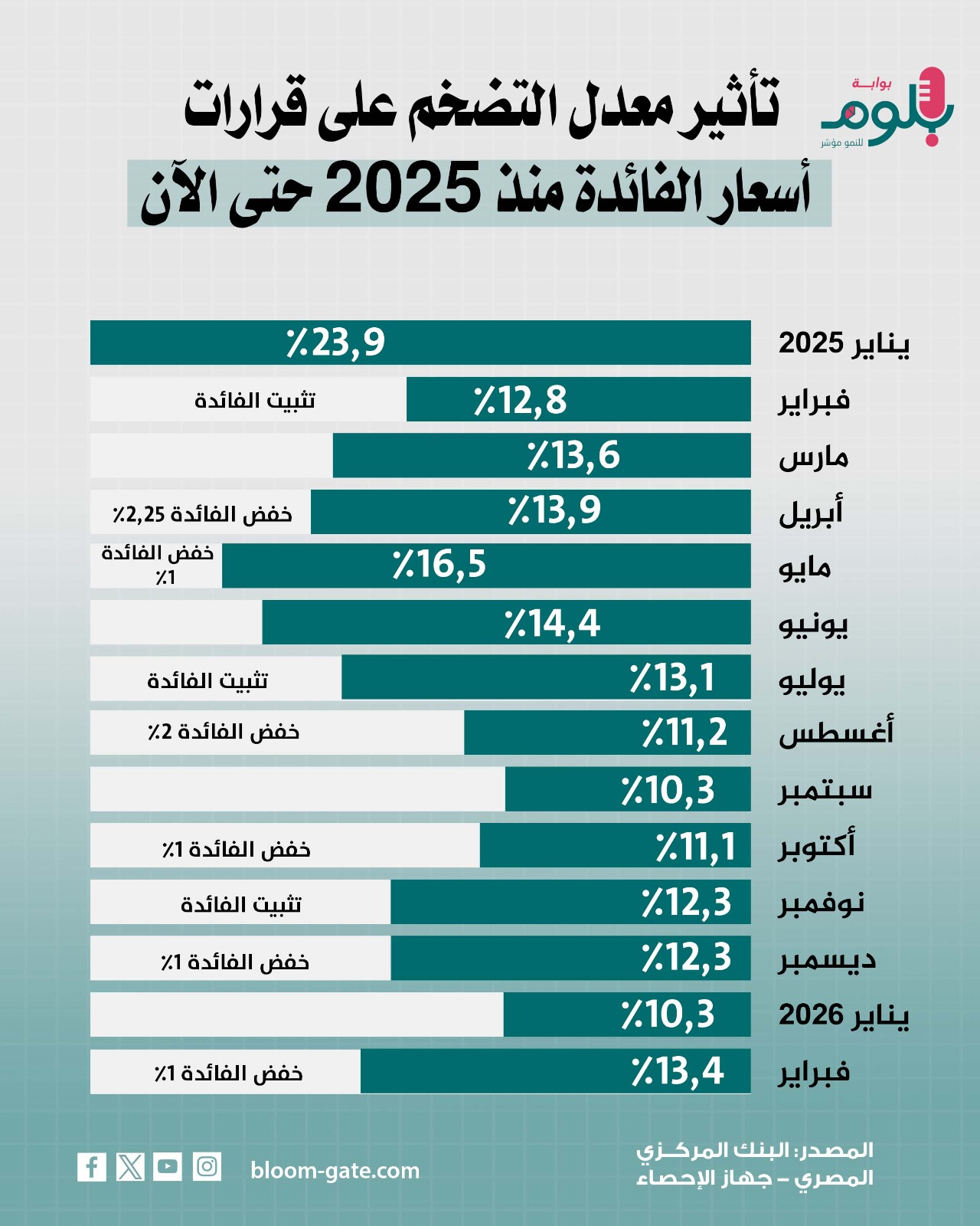 توقع محللون في بنوك الاستثمار أن تتسارع وتيرة التضخم خلال شهري مارس وأبريل بسبب زيادة أسعار الوقود، والارتفاعات المتوالية والسريعة فى أسعار الدولار مقابل العملة المحلية، وذلك بعدما كانت تهيأت مصر لضبط بوصلة التضخم صوب رقم أحادي بنهاية 2026، ونستعرض في الإنفوجراف القادم العلاقة بين معدلات التضخم وقرارات لجنة الساسية النقدية منذ 2025 حتى الآن.