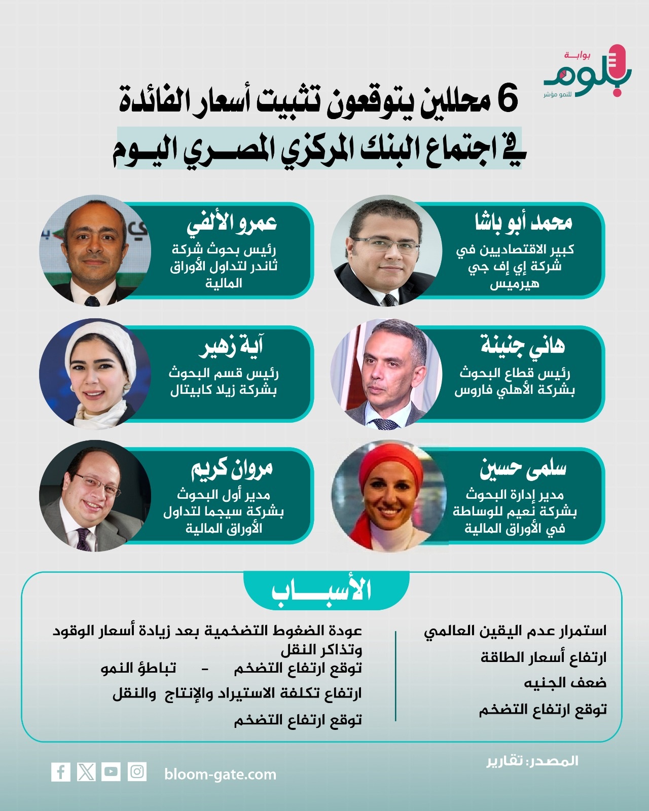 بشكل أكثر تفصيلي، تتفق توقعات المحللين على تثبيت الفائدة، في ضوء الضغوط الاقتصادية وتراجع سعر صرف الجنيه وارتفاع التضخم، ونسلط الضوء في الإنفوجراف التالي على توقعات المحللين لقرار لجنة السياسة النقدية اليوم.