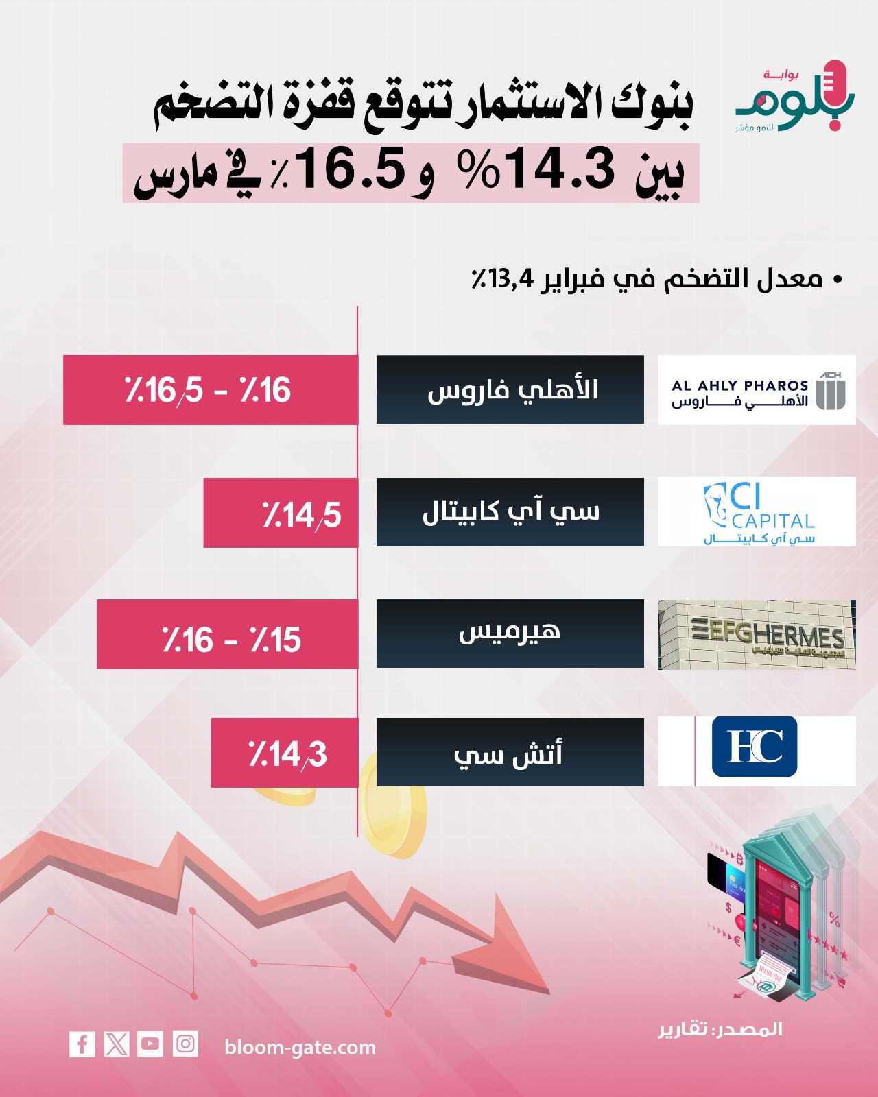 ترجح بنوك الاستثمار حدوث قفزة في معدلات التضخم السنوي في مارس الماضي لتتراوح بين 14.3 إلى 16.5%، في ضوء زيادة أسعار الوقود بواقع 3 جنيهات للتر وبنسب تتراوح بين 14% حتى 30%، إلى جانب ضغوط سعر صرف الجنيه وارتفاع فاتورة واردات الطاقة، ونرصد في الإنفوجراف التالي توقعات بنوك الاستثمار للتضخم.