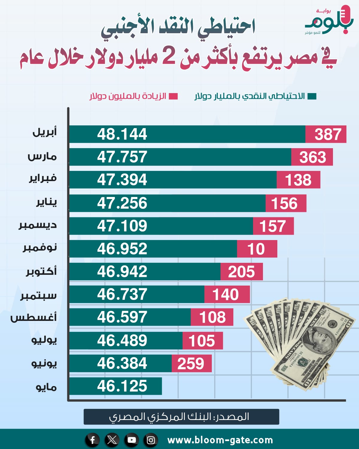 شهد احتياطي النقد الأجنبي في مصر تطورات كبيرة عل مدار أكثر من عام وسجل تحسناً بفضل صفقة رأس الحكمة في مارس 2024، بعد الأزمة التي شهدتها مصر من نقص العملات الأجنبية نتيجة التضخم المتزايد عالميا والتوترات الجيوسياسية، والتي أثرت بقوة على اقتصاد البلاد، ويرصد هذا الإنفوجراف رحلة الاحتياطي الأجنبي خلال آخر 12 شهر.