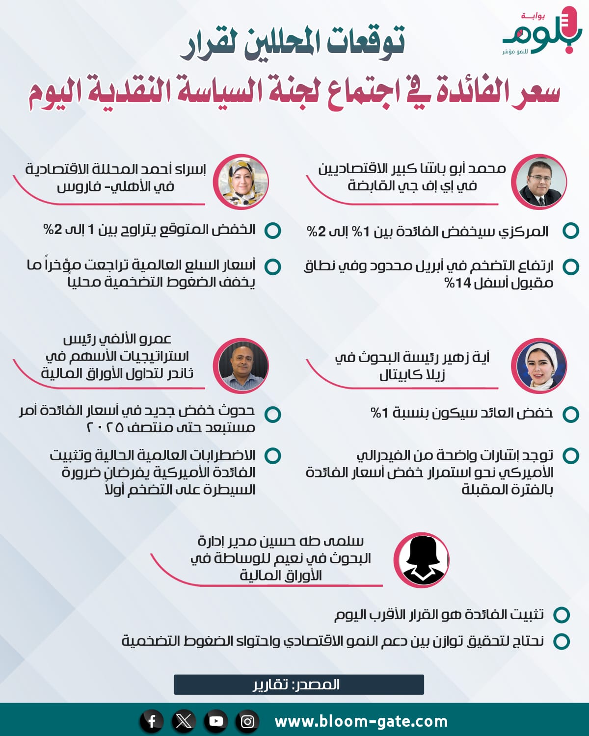 وبشكل أكثر تفصيلي يعدد المحللون الأسباب التي قد يستند إليها البنك المركزي المصري لتحديد مصير أسعار الفائدة سواء كان القرار بخفض العائد أو التثبيت، والتي تتضمن معدلات التضخم والسيولة الدولارية، ووضع الأسواق والبطالة، ويسلط هذا الإنفوجراف الضوء على توقعات المحللين والعوامل الداعمة لها.