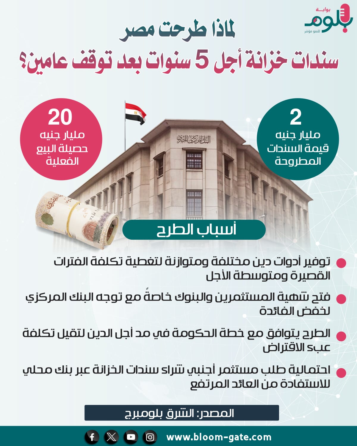 ولأول مرة منذ عامين، باع البنك المركزي المصري بالنيابة عن وزارة المالية، الإثنين الماضي، سندات خزانة محلية بعائد ثابت لأجل 5 سنوات، بعد أن كان هناك توجهاً بأن يكون الحد الأقصى لأجل سندات الخزانة 3 سنوات فقط، فما الدوافع وراء هذا التحول الآن؟ هذا ما سيجيب عنه الإنفوجراف القادم.