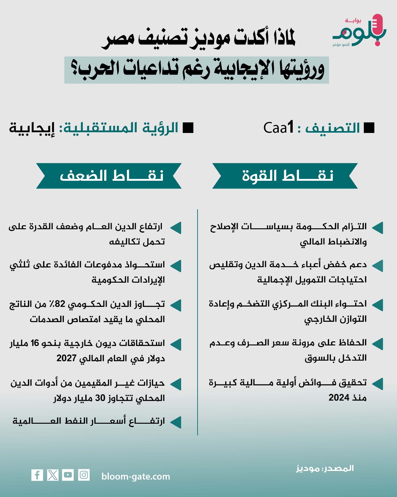 على الرغم من تداعيات الحرب على الاقتصاد المصري، أبقت وكالة موديز للتصنيفات الائتمانية، الجمعة الماضية، التصنيف الائتماني طويل الأجل لمصر بالعملتين الأجنبية والمحلية عند مستوىCaa1، مع الإبقاء على النظرة المستقبلية «إيجابية»، ويعكس ذلك رؤية المؤسسة الدولية لأسس جيدة للاقتصاد المحلي، وفي ضوء ذلك فإن الإنفوجراف القادم سيلقي الضوء على أسباب التقييم الإيجابي لاقتصاد مصر رغم الأضرار المترتبة على حرب إيران.