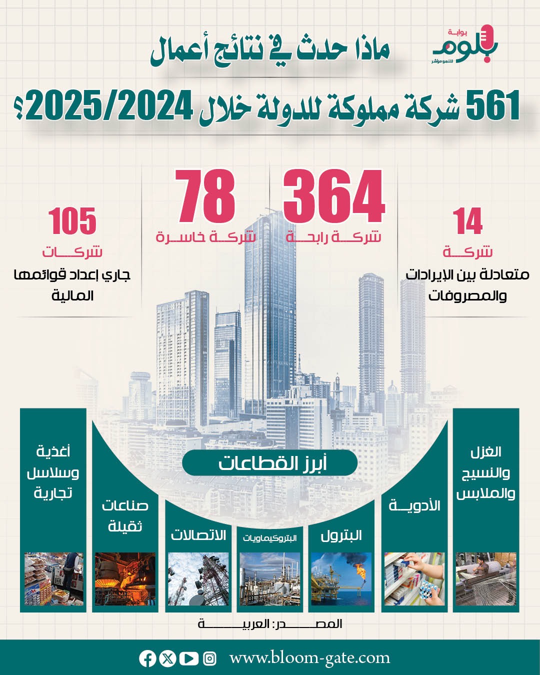 وفي سياق متصل، كشف تقرير حديث صادر عن مركز المعلومات ودعم اتخاذ القرار التابع لمجلس الوزراء حول الشركات المملوكة للدولة عن تراجع عددها من 709 شركات في أغسطس 2024 إلى 561 شركة في أغسطس 2025، أي بانخفاض بلغ 148 شركة تعادل نسبة 20.9% غير أن التقرير لم يوضح أسباب هذا التراجع، ما بين البيع أو الدمج أو إعادة الهيكلة، ومع ذلك فإن الشركات غلبت على نتائج أعمالها تحقيق الربحية، وهي النتائج المالية التي يتناولها الإنفوجراف التالي.