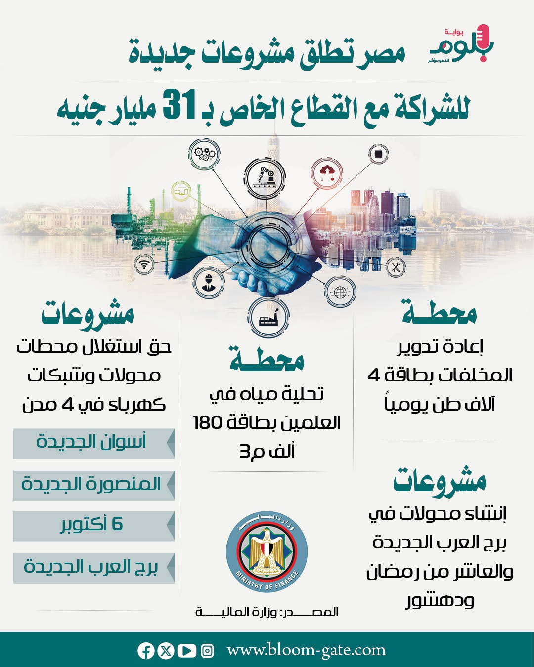 في الوقت نفسه، تتوسع الحكومة في تنفيذ المشروعات بالشراكة مع القطاع الخاص، إذ تعد حزمة مشروعات متكاملة بتكلفة استثمارية تبلغ 31 مليار جنيه، والمقرر تنفيذها بنظام الشراكة بين القطاعين العام والخاص، وفق رئيس وحدة المشاركة مع القطاع الخاص بوزارة المالية عاطر حنورة، مؤكداً أن هذه المشروعات تشمل مجالات تحلية المياه والكهرباء والصرف الصحي ومحطات المحولات وإعادة التدوير، ونلقي الضوء في هذا الإنفوجراف على مشروعات الشراكة الجديدة المطروحة أمام المستثمرين.