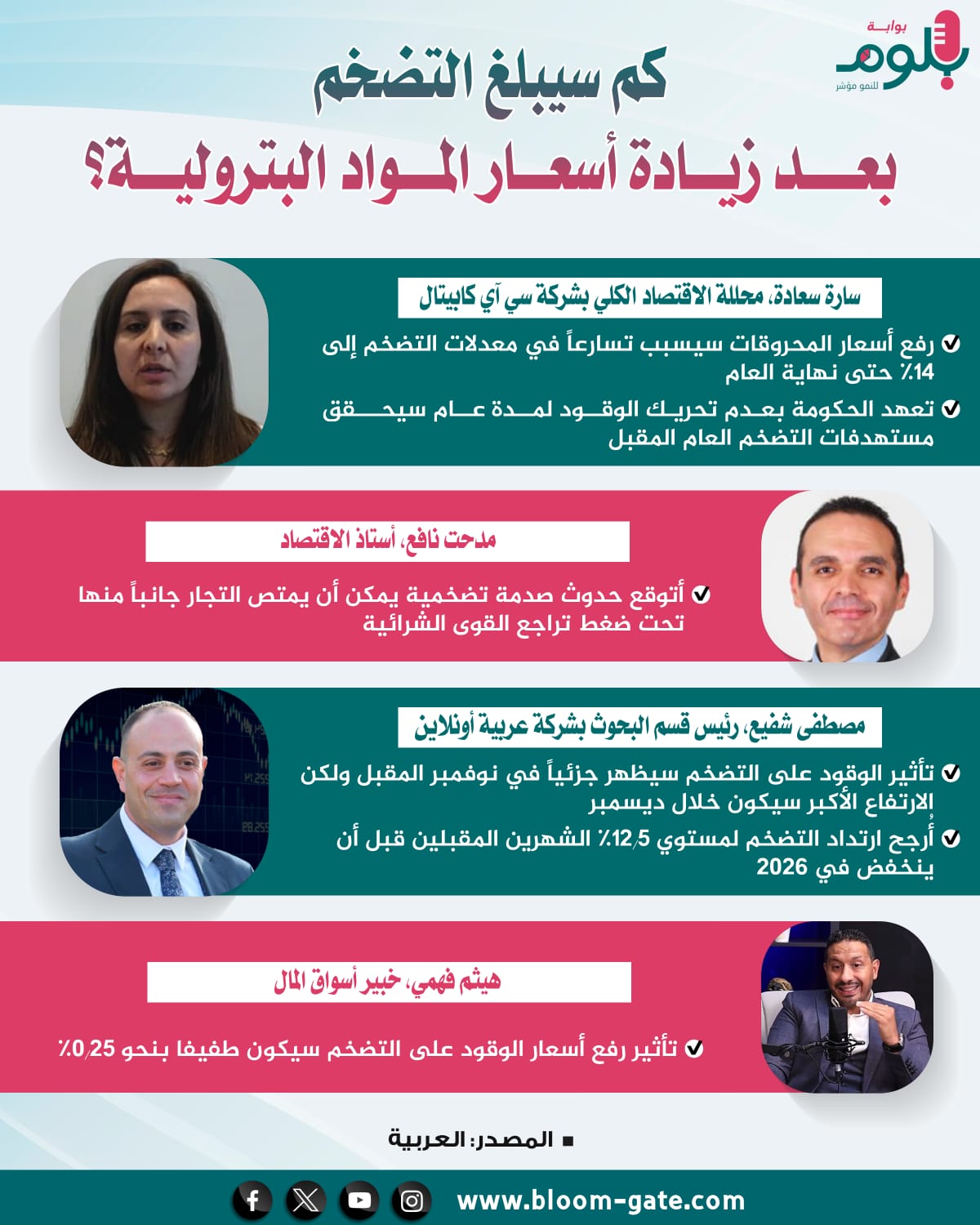 يتوقع محللون أن يدفع تطبيق مصر زيادة جديدة على أسعار الوقود تسارع معدلات التضخم حتى نهاية العام لمستويات تتراوح بين 12.5% و14%، وذلك بعد سلسلة تراجعات متتالية على مدار الأشهر الماضية، لينخفض من مستوى 16.8% في مايو 2025 إلى 11.7% في سبتمبر الماضي، ونستعرض في هذا الإنفوجراف توقعات خبراء الاقتصاد لمعدلات تضخم الأسعار.