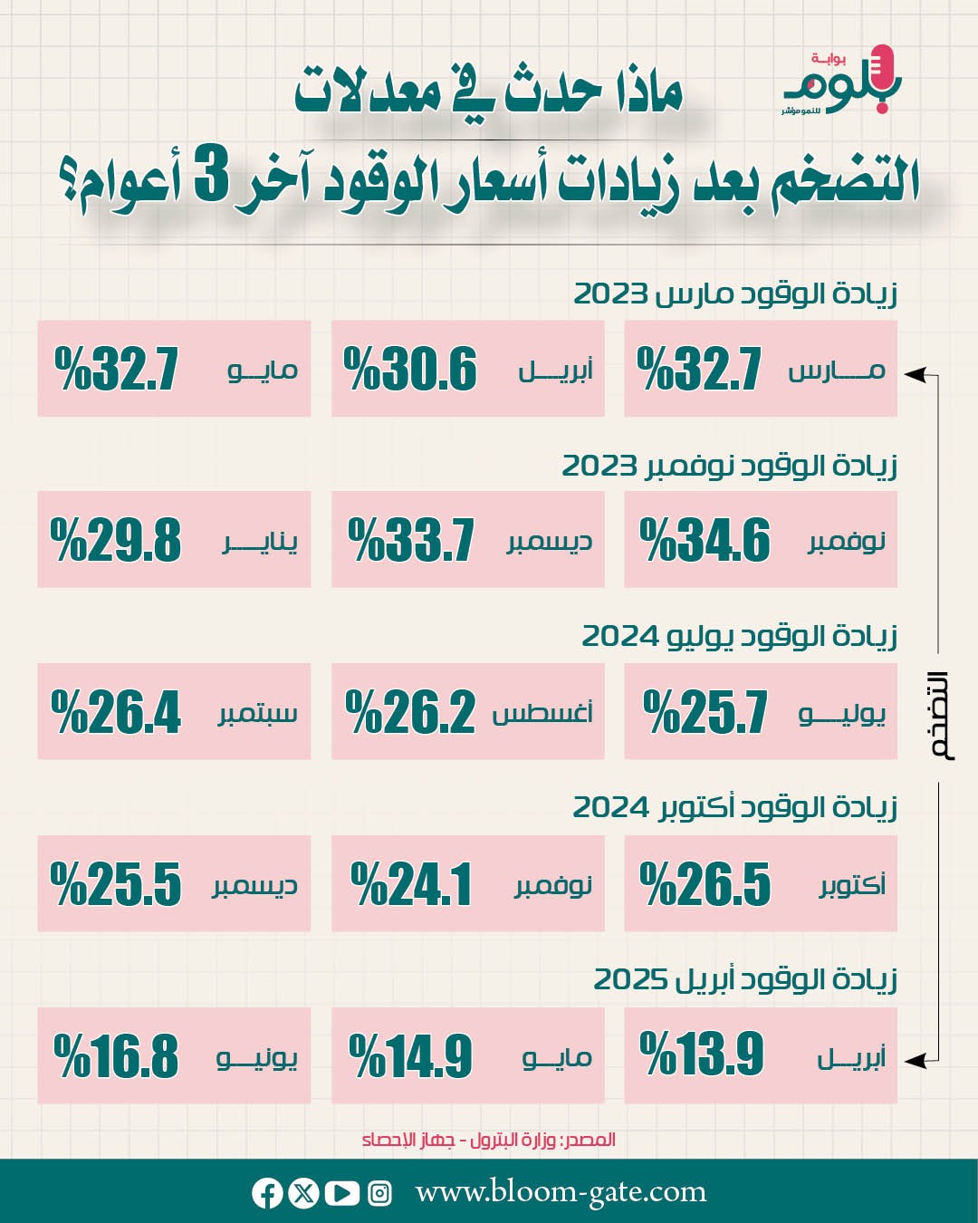 يستهدف البنك المركزي المصري الوصول بمتوسط معدل التضخم إلى نطاق 5% و 9% في الربع الأخير من عام 2026، و3% و 7% في الربع الأخير من عام 2028، وسبق أن حذر مؤخراً في بيان لجنة السياسة النقدية الأخير من أن توقعات التضخم تواجه مخاطر صعودية محلية وأجنبية، منها تحريك الأسعار المحددة إدارياً بما يتجاوز التوقعات، وتصاعد التوترات الجيوسياسية الإقليمية، وللتعرف على تأثير قرار تحريك أسعار المحروقات على قراءة التضخم فإننا نرصد العلاقة بينهما في السنوات الثلاث الأخيرة، خلال الإنفوجراف الآتي.