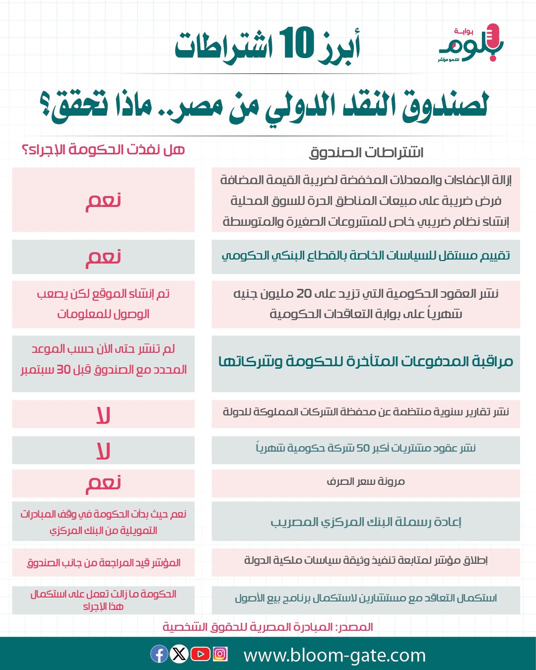 تشهد العلاقة بين صندوق النقد الدولي واقتصاد مصر تحولات كبيرة ما بين الإشادة تارة والتشدد في شروط صرف دفعات برنامج التمويل تارةً أخرى، ما أدى إلى تأخر المراجعة الرابعة قبل حسمها في مارس الماضي وصرف مبلغ 1.2 مليار دولار، ثم دمج وتأجيل المراجعتين الخامسة والسادسة منذ منتصف العام الجاري حتى الآن، وفي ضوء ذلك نرصد أبرز 10 اشتراطات لصندوق النقد للإصلاح الاقتصادي وماذا حققت مصر منها في هذا الإنفوجراف.