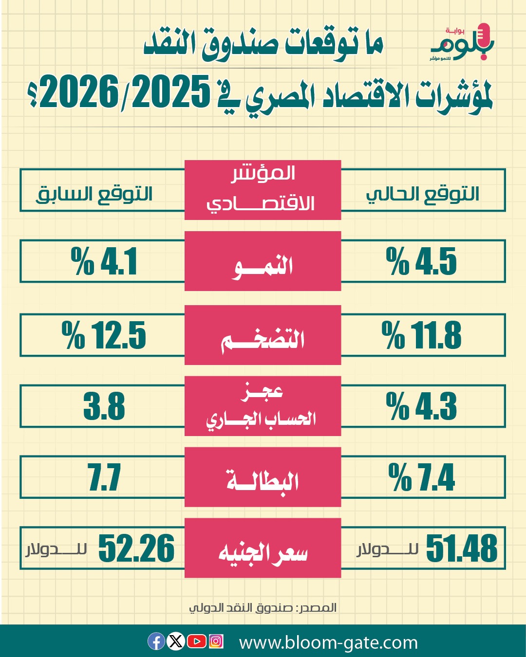 من جانب آخر يتبنى صندوق النقد الدولي نظرة متفائلة تجاه الاقتصاد المصري، إذ رفع توقعاته لمعدل النمو في السنة المالية الجارية بدعم من أداء أفضل من المتوقع في النصف الأول من العام الجاري، فضلاً عن خفض توقعات التضخم والبطالة وسعر الجنيه، وهي المؤشرات التي نستعرضها في الإنفوجراف الآتي.