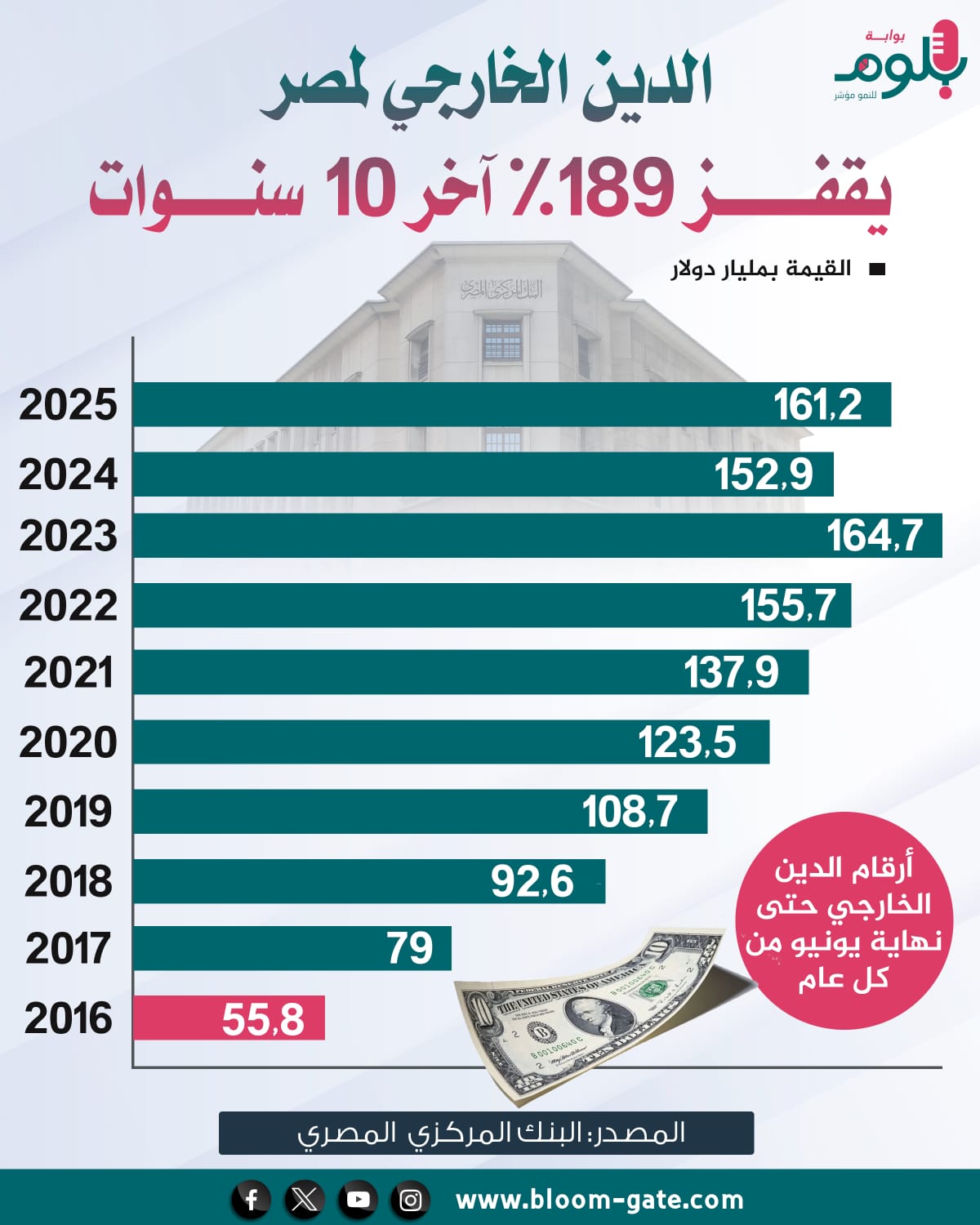 يشكل ارتفاع الدين أحد الملفات الشائكة خلال المراجعتين القادمتين لصندوق النقد لبرنامج الإصلاح الاقتصادي، وقد سجل الدين الخارجي لمصر تحديداً على مدار السنوات العشر الأخيرة قفزات كبيرة غير مسبوقة، وسط توجه الحكومات المتعاقبة على الاعتماد على التمويلات الخارجية سواء من المؤسسات التنموية وصندوق النقد الدولي والشركاء والمستثمرين في أسواق الدين العالمي، في سد الفجوة التمويلية أو تنفيذ المشروعات، وللتعرف على تطور الاقتراض الخارجي للبلاد خلال العقد الأخير يمكن الاطلاع على هذا الإنفوجراف.
