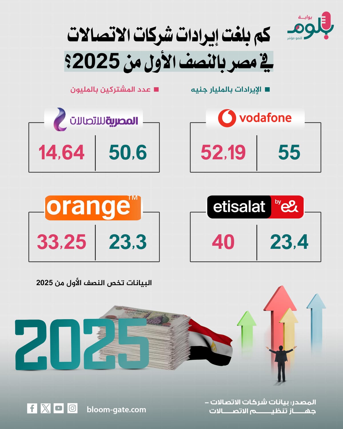 وتأتي مطالبات الشركات برفع أسعار كروت الشحن وخدمات الاتصالات في الوقت الذي ارتفع فيه عدد عملاء المحمول في مصر إلى 140.08 مليون مشترك بنهاية يونيو الماضي مقابل 134.32 مليون مشترك بنهاية ديسمبر الماضي بزيادة 5.76 مليون مشترك جديد خلال النصف الأول من العام الحالي، وانعكس ذلك على زيادة إيرادات شركات الاتصالات الأربعة العاملة في مصر، وفي ضوء ذلك نرصد في هذا الإنفوجراف تطور قاعدة عملاء وإيرادات الشركات.