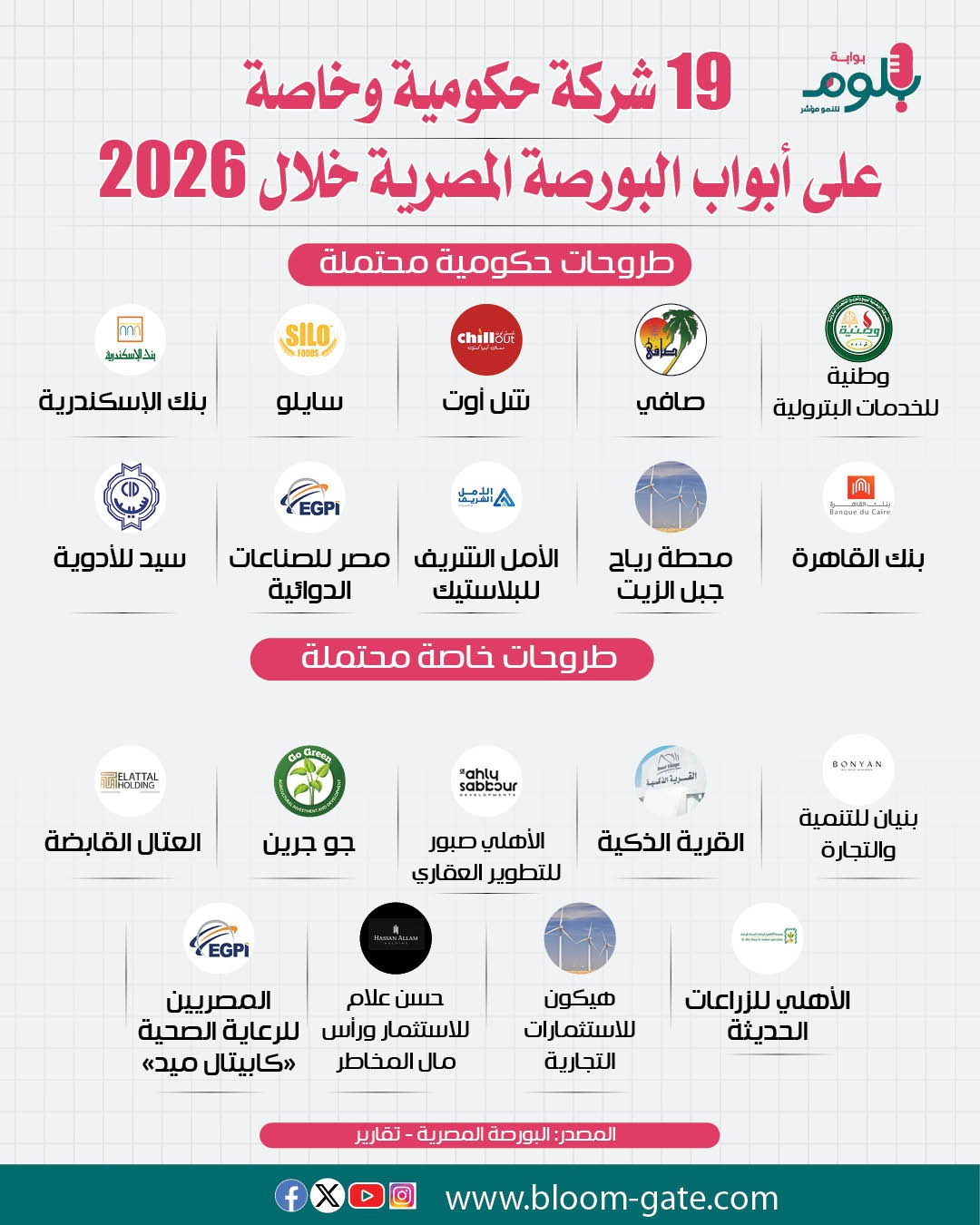 ويعزز إسلام عزام، رئيس البورصة المصرية، نفس التوجه كاشفًا عن أن السوق يستعد لاستقبال طرح نحو 8 شركات جديدة في 2026، تشمل شركات في القطاعين الطبي والسياحي، وسط توقعات بأن تكون السنة المقبلة من أفضل سنوات الطرح العام للأسهم في تاريخ البورصة، خاصةً بعد أن استقطبت 7 شركات جديدة لقائمة القيد في 2025، ويرصد الإنفوجراف التالي قائمة بأبرز الطروحات الحكومية والخاصة المرشحة هذا العام.